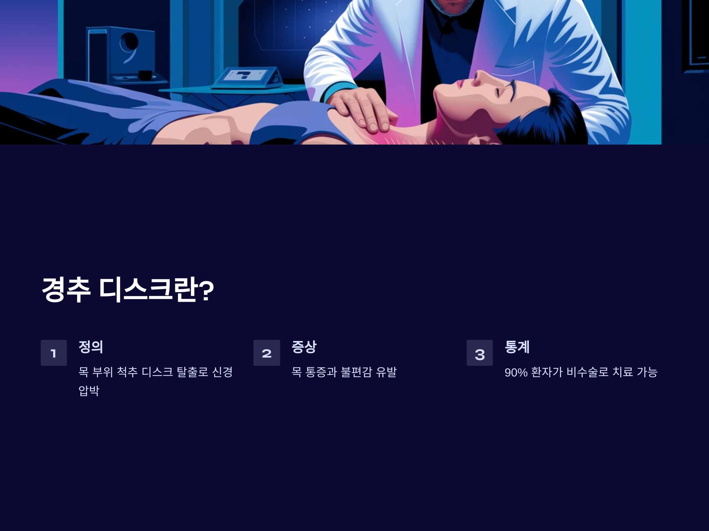 경추 디스크 탈출증은 목 부위의 척추 사이에 있는 디스크가 탈출하여 신경을 압박함으로써 통증과 불편감을 유발하는 질환입니다. 최근 연구에 따르면, 약 90%의 환자들이 수술 없이도 약물 치료와 물리치료 등의 보존적 치료만으로 6개월 이내에 증상이 호전된다고 합니다. citeturn0search10 이러한 비수술적 치료 방법 중 물리치료와 신경 주사는 효과적인 통증 완화 수단으로 주목받고 있습니다.
