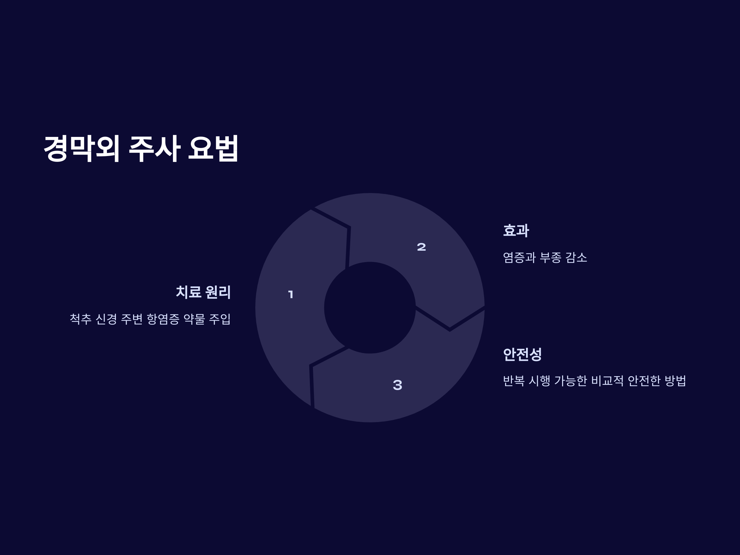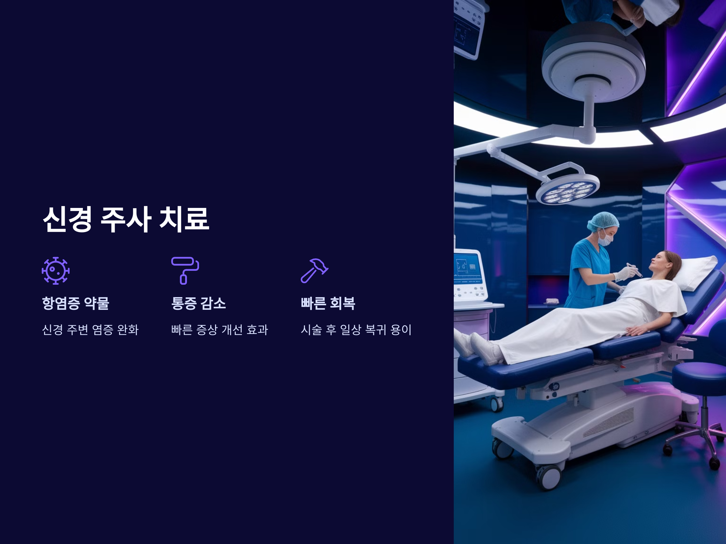 신경 주사 치료는 통증을 유발하는 신경 주변에 항염증 작용을 가진 약물을 주입하여 염증을 가라앉히고 통증을 감소시키는 방법입니다. citeturn0search5 경막외 주사 요법은 신경 주변의 염증을 억제하고 부종을 완화시켜 증상을 개선하는 데 효과적입니다. 이 치료는 비교적 간단하며, 시술 후 빠른 회복이 가능하다는 장점이 있습니다.