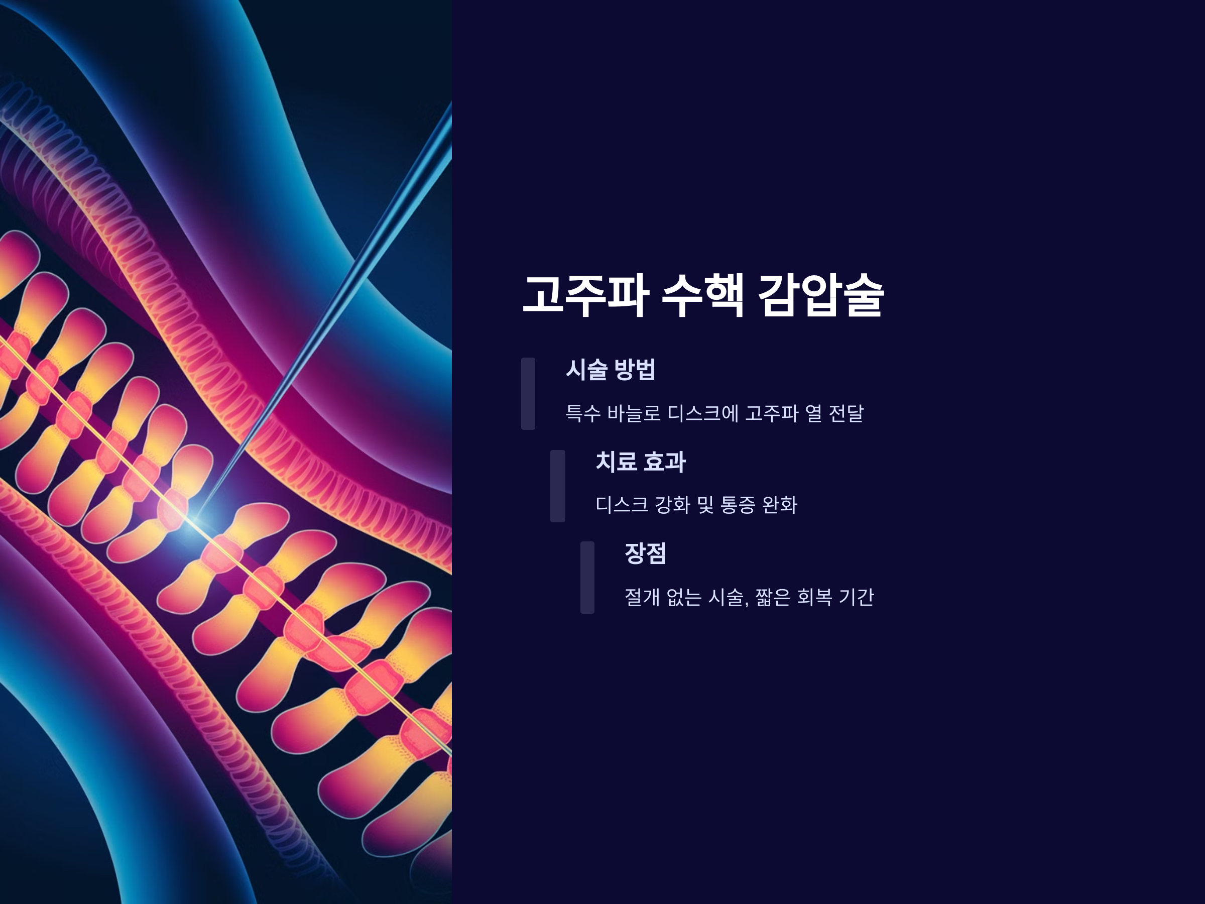 고주파 수핵 감압술은 디스크의 손상과 퇴화 과정에서 발생하는 만성 디스크 병인성 요통을 치료하는 비수술적 방법입니다. citeturn0search1 특수한 바늘을 사용하여 디스크 내부에 고주파 열을 전달함으로써 디스크를 튼튼하게 만들고 통증을 완화시킵니다. 이 시술은 절개 없이 진행되며, 회복 기간이 짧아 일상생활로의 복귀가 빠릅니다.