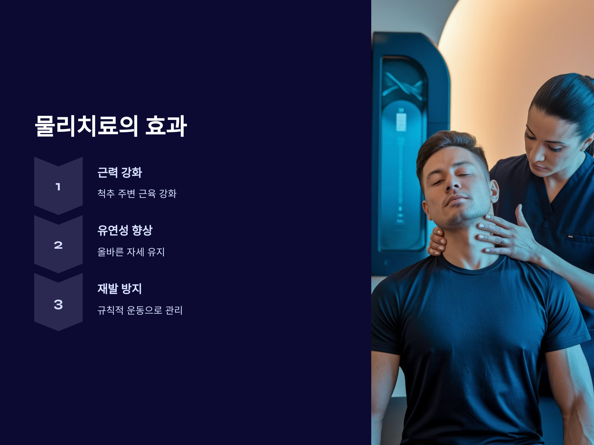 물리치료는 경추 디스크 탈출증 환자에게 필수적인 치료 방법 중 하나입니다. 근력 강화 운동과 스트레칭을 통해 척추 주변 근육을 강화하고 유연성을 향상시켜 통증을 완화시킵니다. citeturn0search7 특히, 올바른 자세 유지와 규칙적인 운동은 재발 방지에도 큰 도움이 됩니다. 물리치료는 전문 물리치료사의 지도 아래 개인별 상태에 맞게 진행되어야 하며, 꾸준한 관리가 중요합니다.