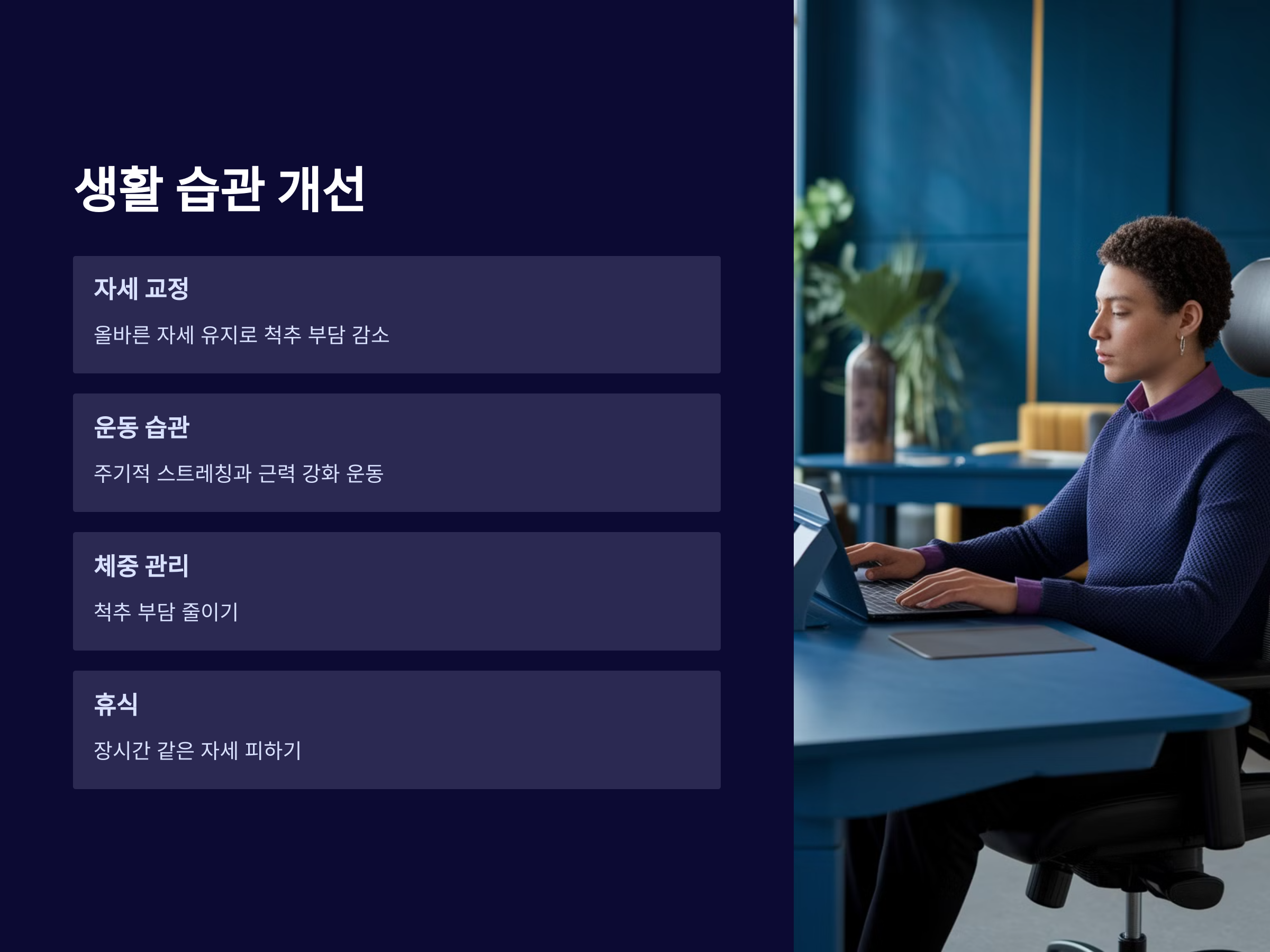 경추 디스크 탈출증의 재발을 방지하기 위해서는 올바른 생활 습관이 중요합니다. 장시간 앉아 있는 것을 피하고, 주기적인 스트레칭과 허리 및 등의 근력 강화 운동을 통해 척추 건강을 유지해야 합니다. citeturn0search13 또한, 올바른 자세를 유지하고 체중 관리를 통해 척추에 가해지는 부담을 줄이는 것이 필요합니다.
