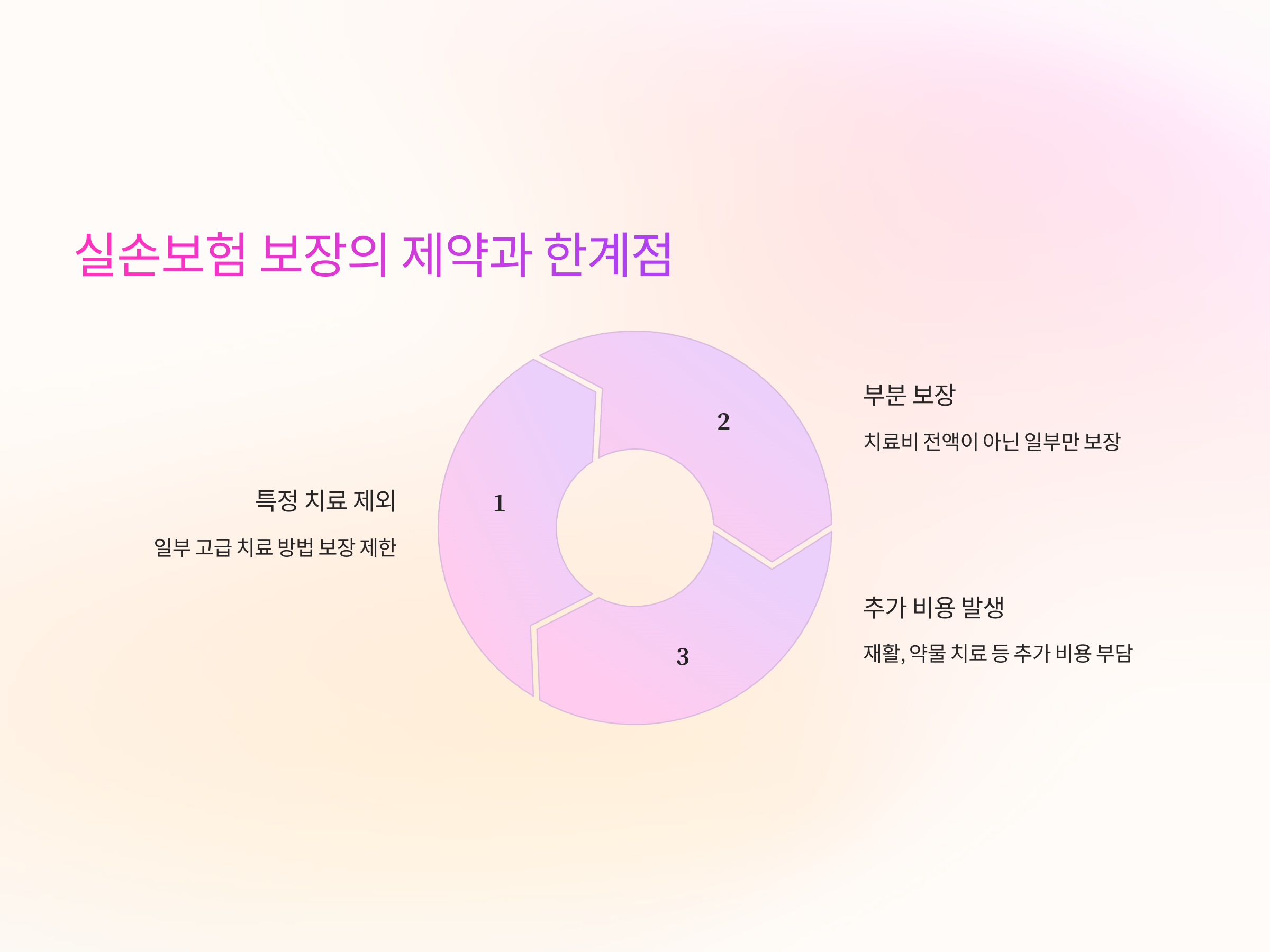 실손보험이 경추 디스크 시술을 보장하긴 하지만, 모든 치료 항목이 포함되지는 않습니다. 예를 들어, 일부 특정 치료나 고급 치료 방법에 대해서는 보장이 제한될 수 있습니다. 또한, 치료가 끝난 후에도 재발 가능성에 따른 장기 치료나 관리가 필요한 경우 추가 비용이 발생할 수 있습니다.