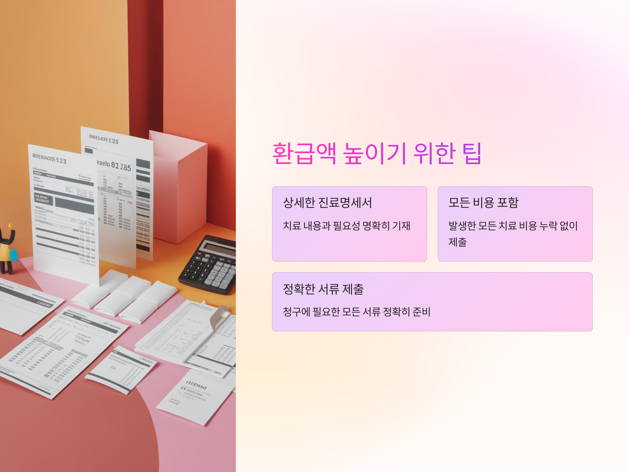 실손보험을 통해 경추 디스크 시술의 치료비를 환급받을 때, 환급액을 높이기 위한 몇 가지 팁을 알아두면 유리합니다. 단순히 치료비만 청구하는 것이 아니라, 청구 시 필요한 서류를 정확히 준비하고, 보장 항목에 맞는 청구를 하면 보다 많은 환급액을 받을 수 있습니다.