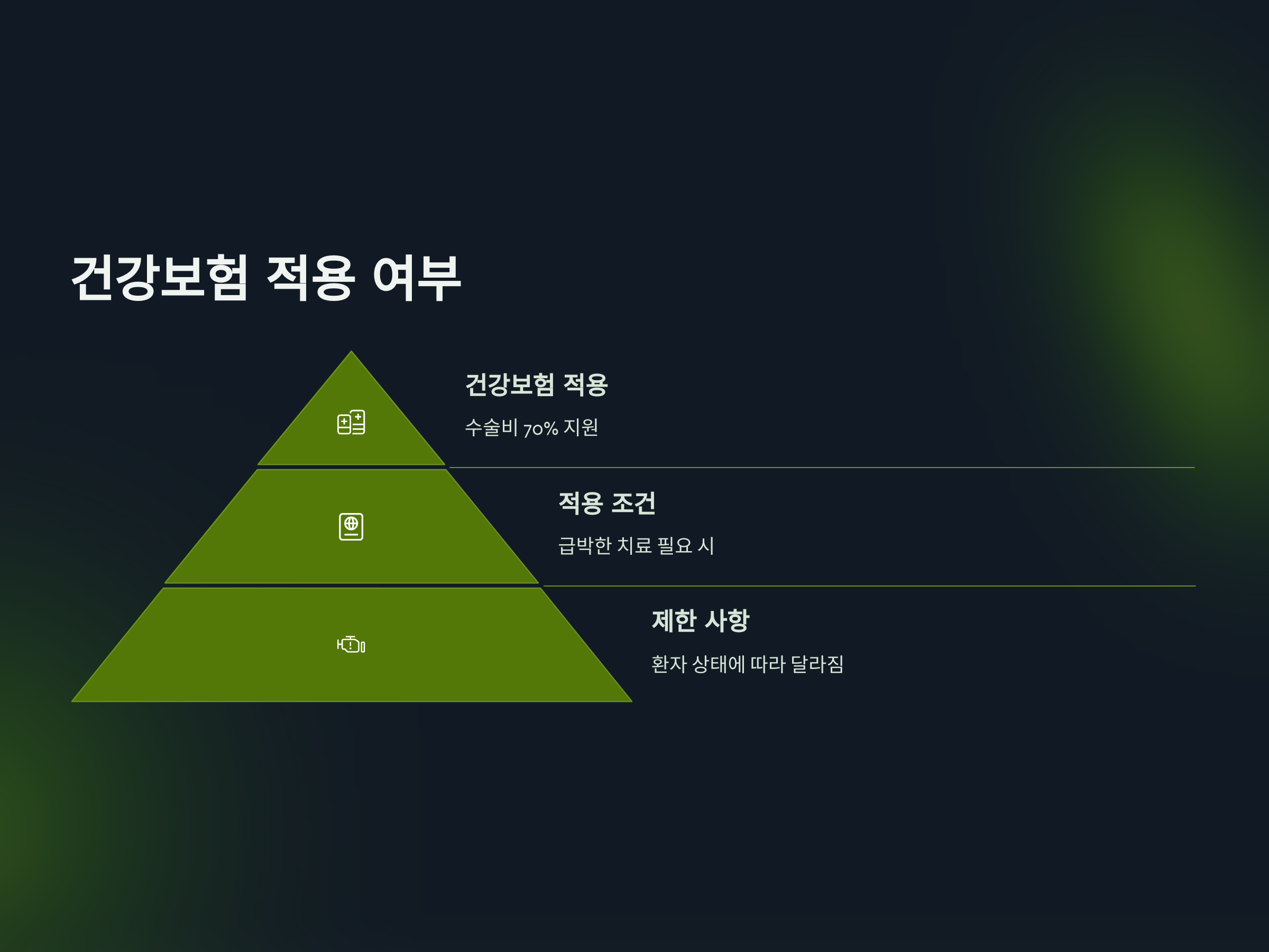 경추 디스크 신경 감압술은 건강보험이 적용되는 수술입니다. 하지만 건강보험 적용 범위에는 일부 제한이 있을 수 있습니다. 예를 들어, 치료가 급박하고, 보존적 치료로 해결할 수 없는 경우에만 보험 적용이 될 수 있으며, 이 때에도 환자의 상태에 따라 보험 적용 여부가 달라질 수 있습니다.