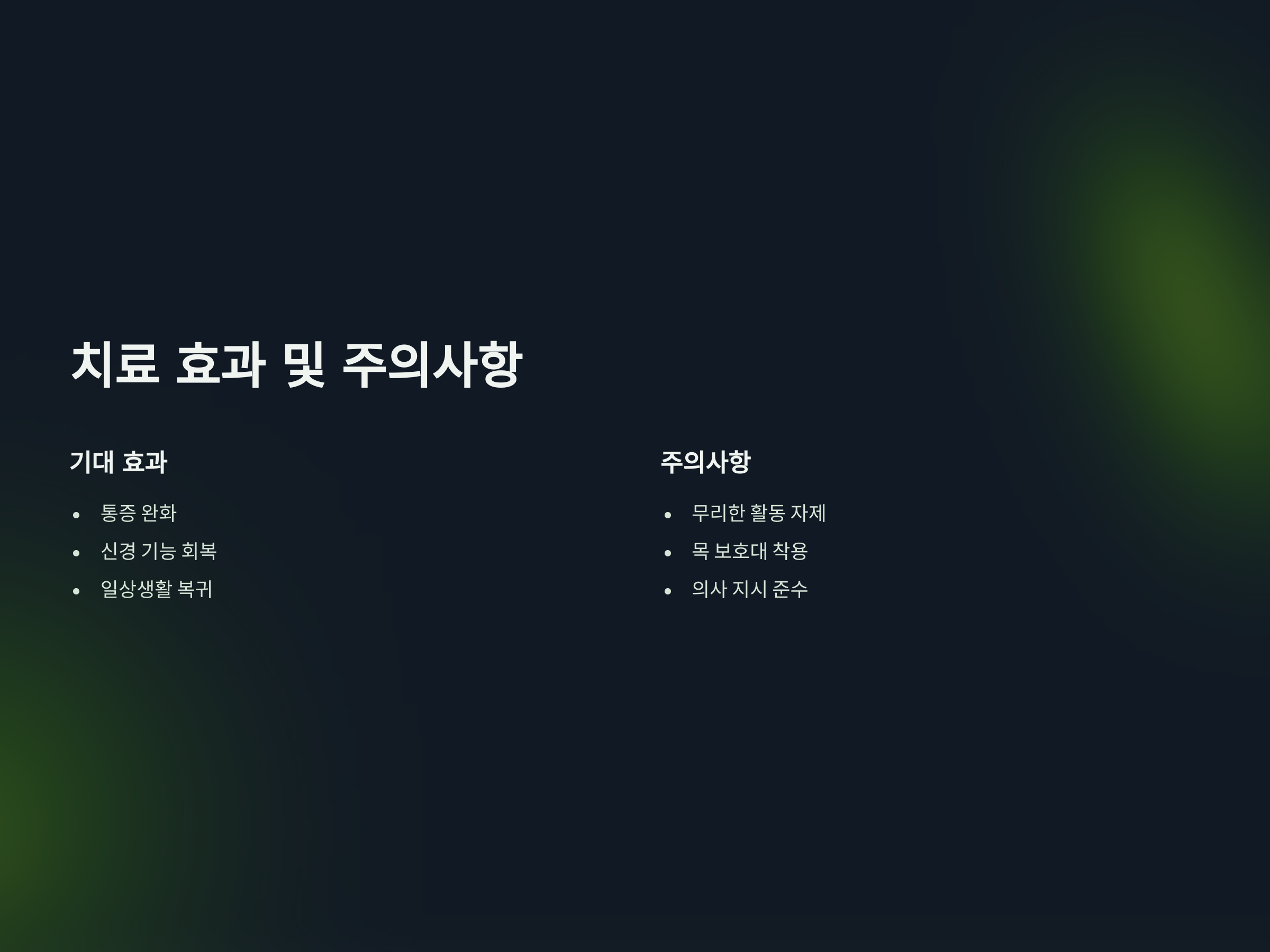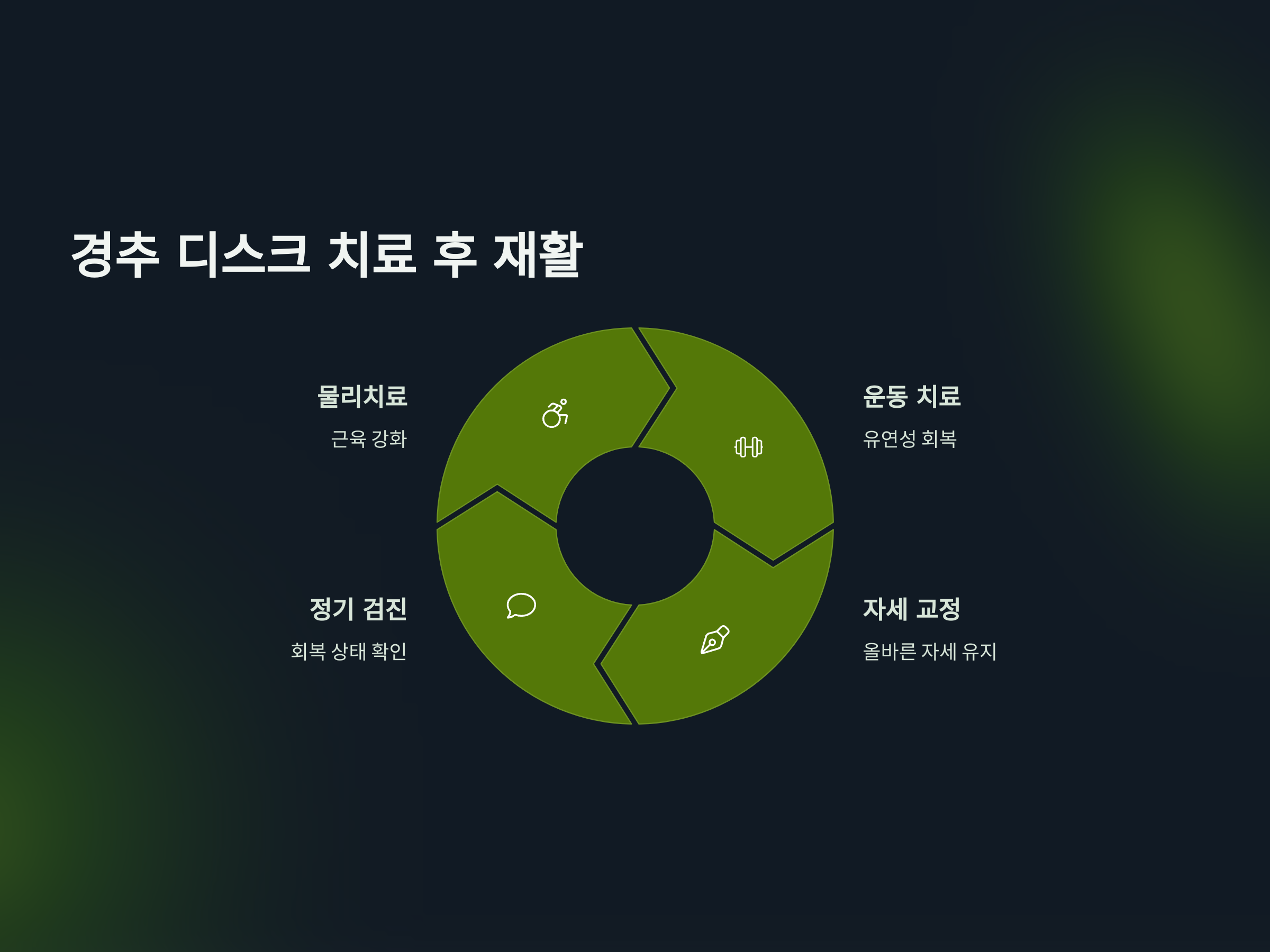 경추 디스크 신경 감압술 후 회복은 중요한 부분입니다. 수술 후 적절한 재활 치료를 받지 않으면, 재발의 위험이 있을 수 있기 때문에 수술 후 재활 프로그램에 적극적으로 참여하는 것이 중요합니다. 일반적으로 재활 치료는 물리치료나 운동 치료, 체온 조절 등을 포함하며, 환자가 일상생활에 빨리 복귀할 수 있도록 도와줍니다. 또한, 수술 후 일정 기간 동안 목에 무리를 주지 않는 것이 중요하며, 재활 기간 동안 꾸준히 의사의 지도에 따르는 것이 좋습니다.