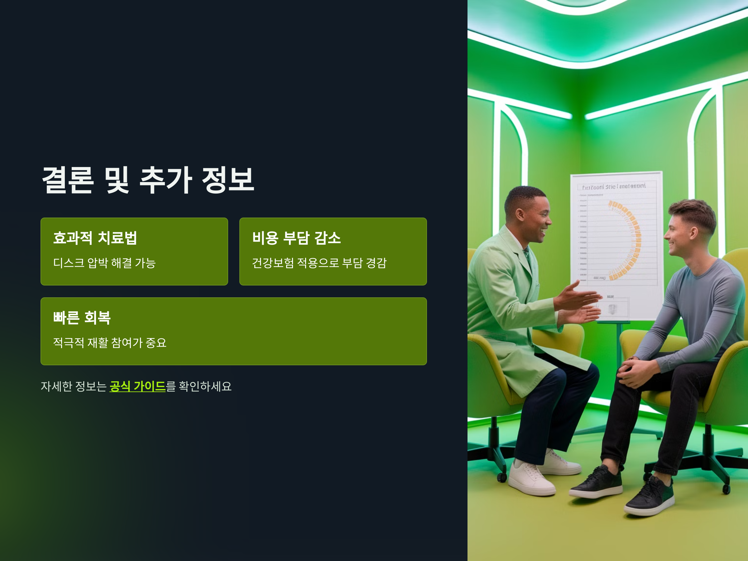 따라서 경추 디스크 신경 감압술을 고려하는 환자는 수술 전 병원에서 건강보험 적용 여부와 보장 범위를 정확히 확인하는 것이 중요합니다. 일반적으로 건강보험이 적용되면 환자는 수술 비용의 약 30%만 부담하면 되며, 나머지 70%는 건강보험에서 지원됩니다.