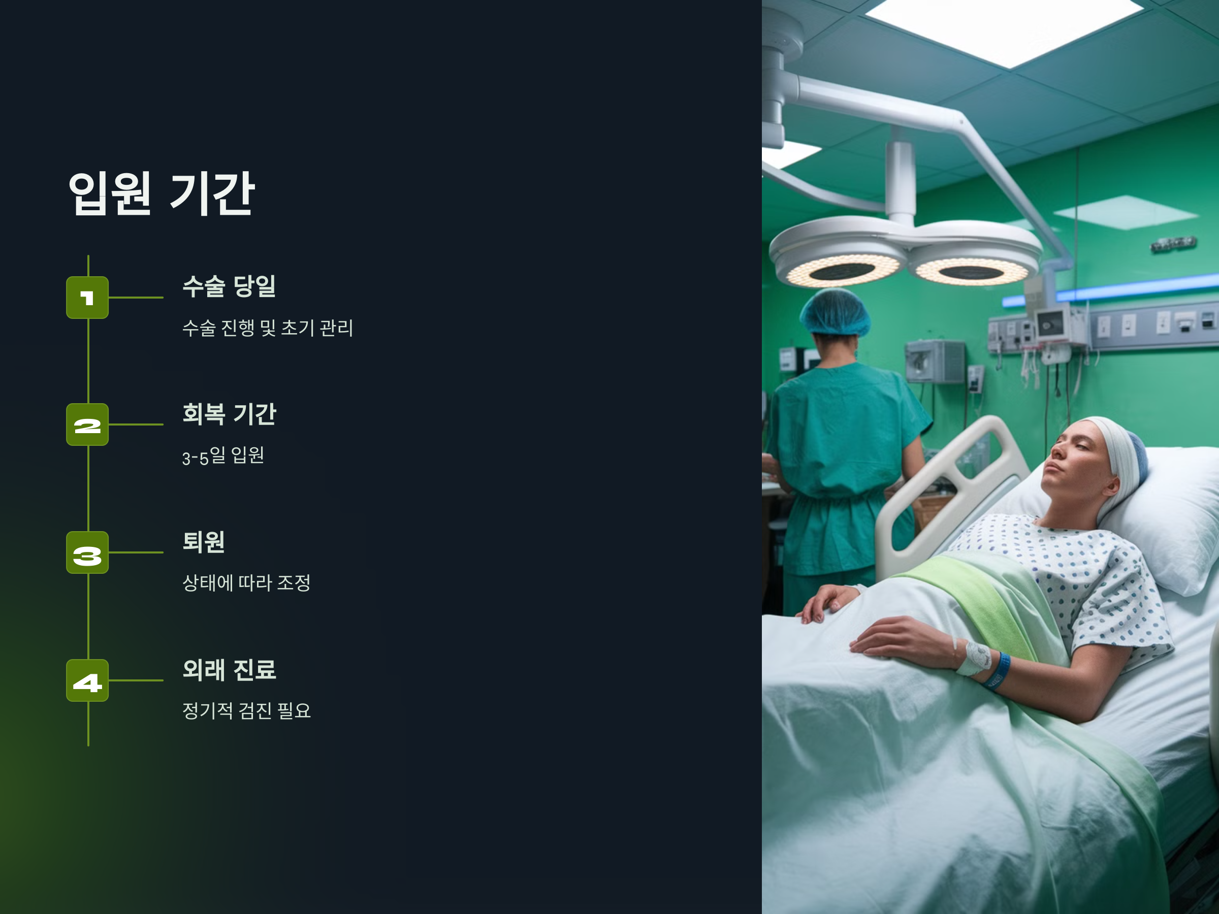 다만, 입원 기간은 환자의 회복 상황에 따라 더 길어질 수 있으며, 퇴원 후에도 일정 기간 동안 외래 진료와 재활 치료가 필요할 수 있습니다. 따라서 입원 기간 동안의 치료비용과 퇴원 후 재활 치료비용에 대해 미리 확인해 두는 것이 좋습니다.