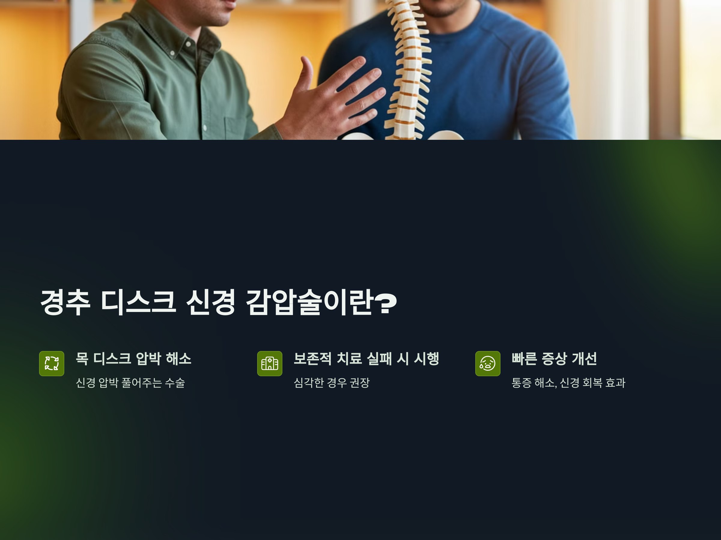 경추 디스크 신경 감압술은 목 부위의 디스크가 신경을 압박하여 통증이나 신경학적 증상을 일으킬 때, 그 압박을 풀어주는 수술적 방법입니다. 이 수술은 보통 보존적 치료로 개선되지 않은 심각한 경우에 시행되며, 증상이 빠르게 개선될 수 있습니다. 특히 신경 감압술을 통해 디스크를 제거하거나 신경을 풀어주는 과정을 통해 통증을 해소하고, 손상된 신경을 회복시키는 효과를 기대할 수 있습니다.
