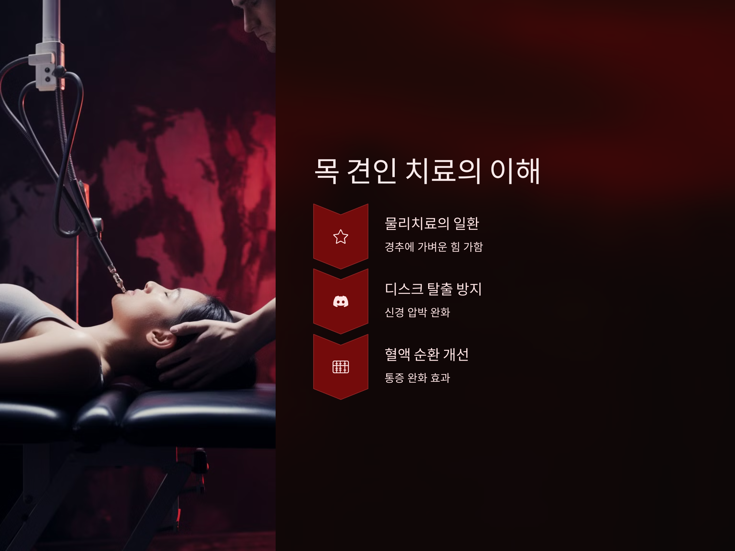 목 견인 치료는 비수술적이고 비교적 간단한 방법으로, 많은 환자들이 선호하는 치료법입니다. 주로 경추 디스크로 인한 가벼운 통증이나 초기 단계의 디스크 탈출증에 효과적입니다. 이 치료는 디스크에 가해지는 압력을 줄이고, 신경에 가해지는 자극을 완화하는 데 도움을 줍니다.