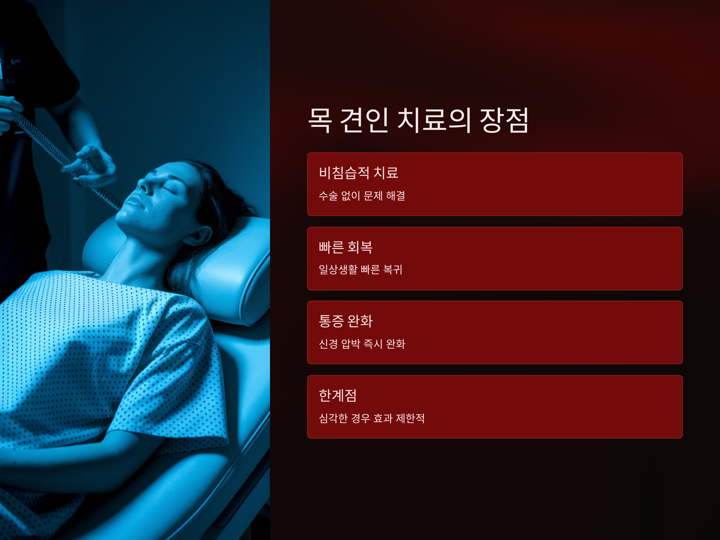 목 견인 치료의 가장 큰 장점은 비침습적이라는 점입니다. 즉, 수술을 하지 않고도 경추의 통증을 완화시킬 수 있으며, 치료 후 일상생활로의 복귀가 빠릅니다. 하지만 이 치료법은 모든 환자에게 효과적인 것은 아니며, 디스크 탈출이 심하거나 다른 원인으로 인한 통증일 경우에는 효과가 제한적일 수 있습니다.
