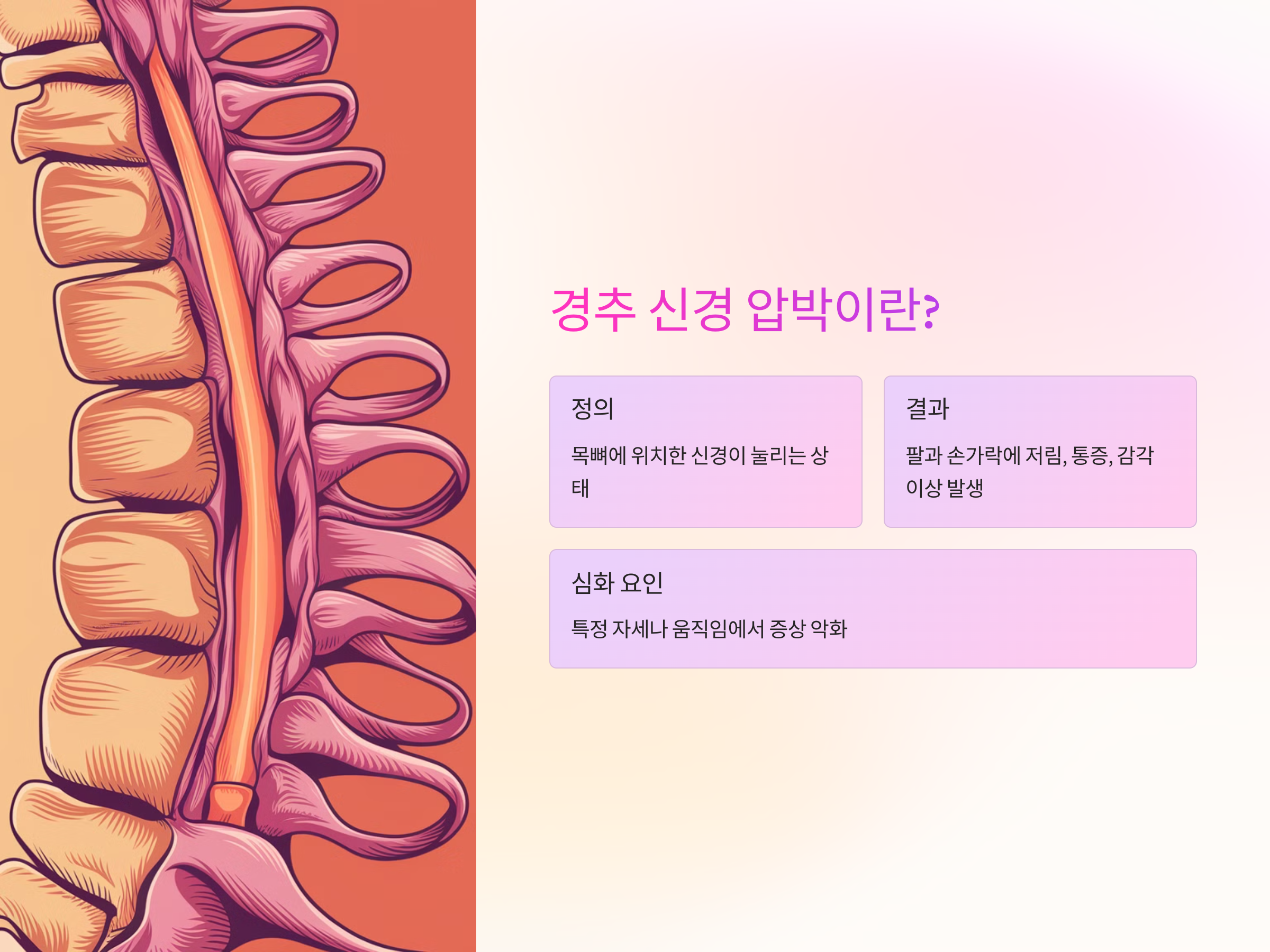 경추 신경 압박은 목뼈(경추)에 위치한 신경이 눌리는 상태를 의미합니다. 신경 압박은 주로 디스크 탈출증, 골관절염, 또는 목의 근육 긴장으로 인해 발생할 수 있습니다. 이런 상태가 발생하면 팔과 손가락에서 저림, 통증, 또는 감각 이상을 경험하게 됩니다. 경추 신경 압박은 특정 자세나 움직임에서 더 심해질 수 있기 때문에 초기에 적절한 대응이 중요합니다.