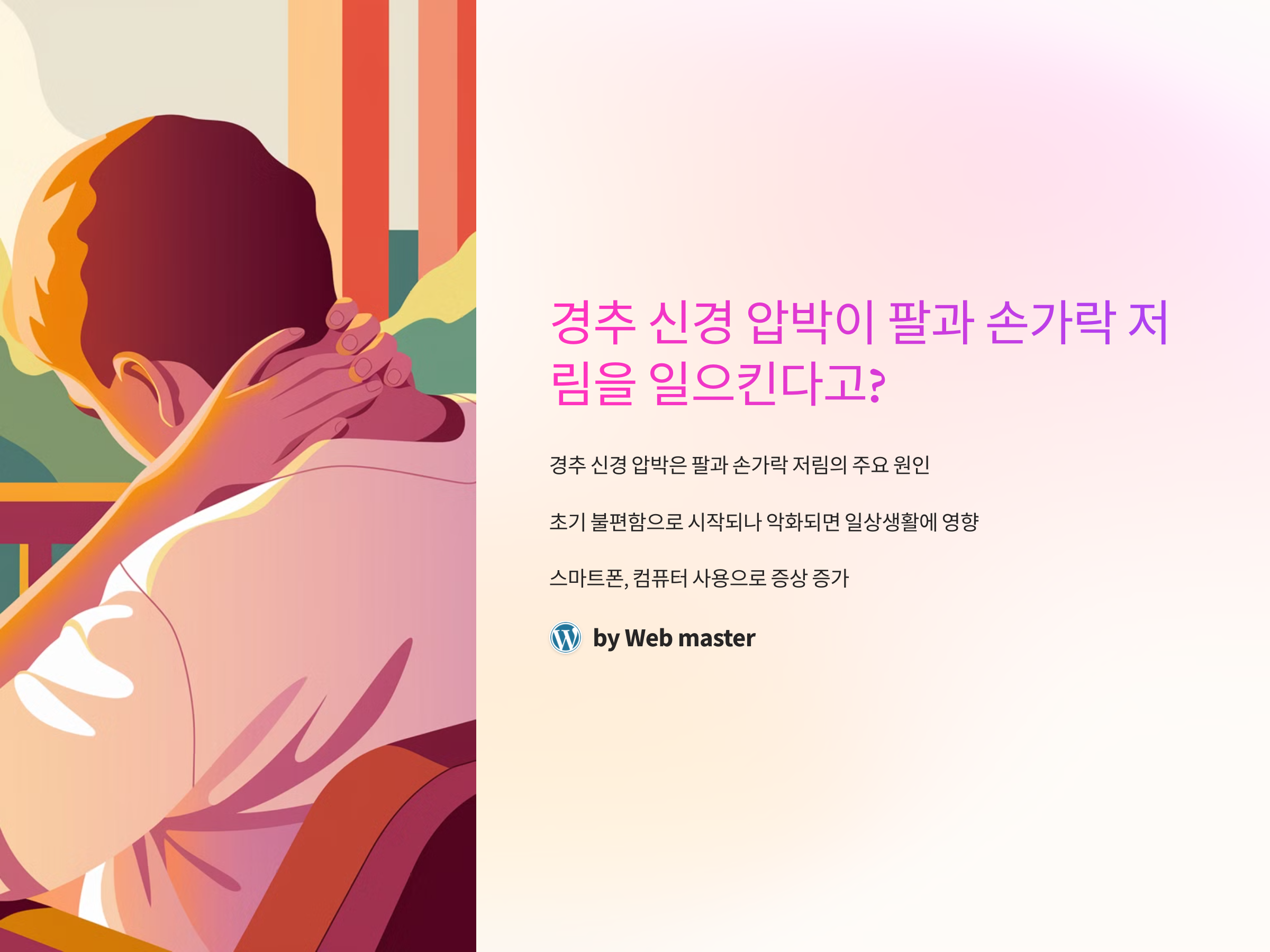 경추 신경 압박으로 인해 팔과 손가락에 저림 증상이 발생할 수 있다는 사실, 알고 계셨나요? 이 문제는 특히 디스크 문제나 목의 근육 긴장 등 여러 원인으로 발생할 수 있습니다. 초기에는 작은 불편함으로 시작할 수 있지만, 적절한 치료를 받지 않으면 증상이 악화되어 일상생활에 큰 영향을 미칠 수 있습니다. 오늘은 경추 신경 압박이 팔과 손가락 저림을 일으키는 원인과 그에 대한 해결 방법을 자세히 알아보겠습니다.