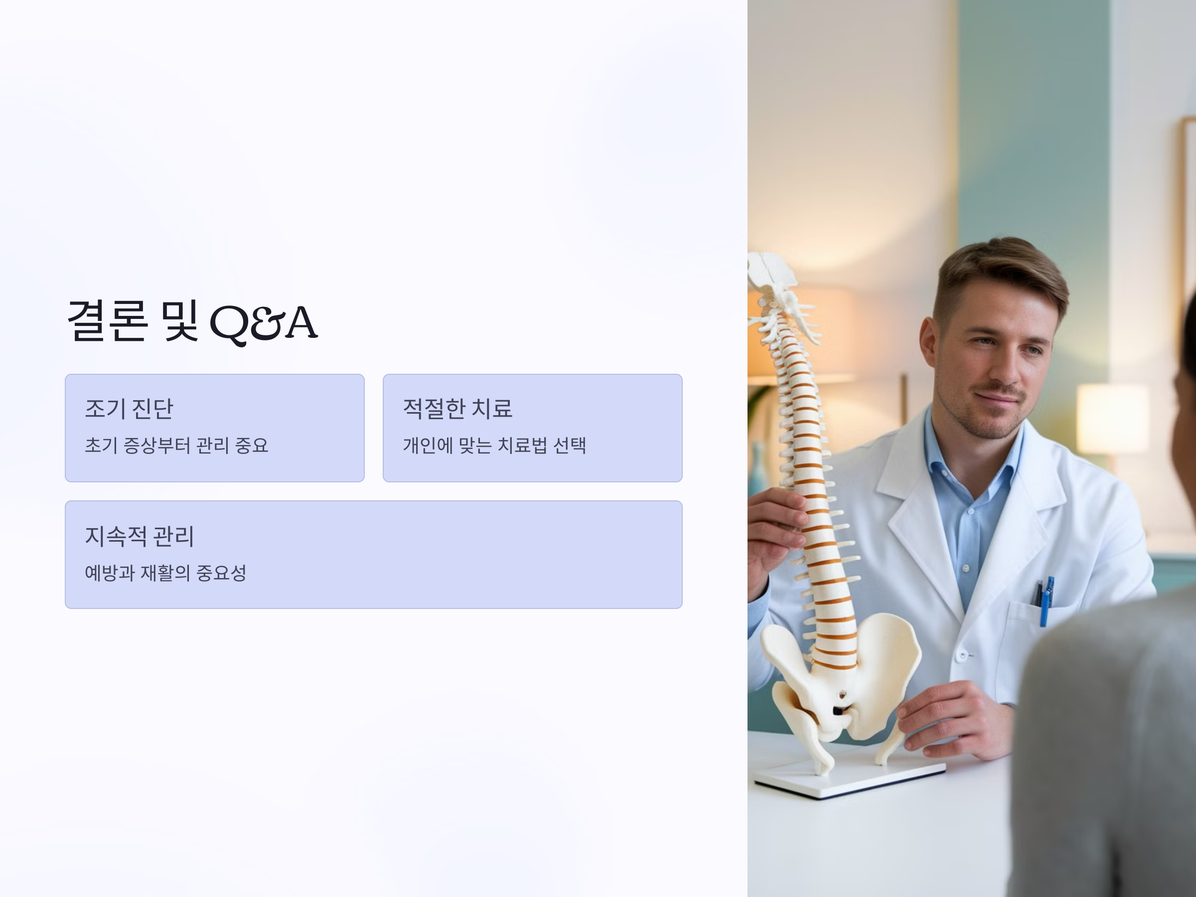 경추 협착증은 초기 증상에서부터 적절히 관리하면 많은 경우 비수술적 방법으로 통증을 완화할 수 있습니다. 그러나 증상이 심해지면 수술이 필요할 수 있으므로, 증상이 의심되면 빠른 시일 내에 전문의와 상담하는 것이 중요합니다. 예방을 위한 생활습관 개선과 꾸준한 운동은 경추 협착증의 진행을 늦추는 데 큰 도움이 될 수 있습니다.