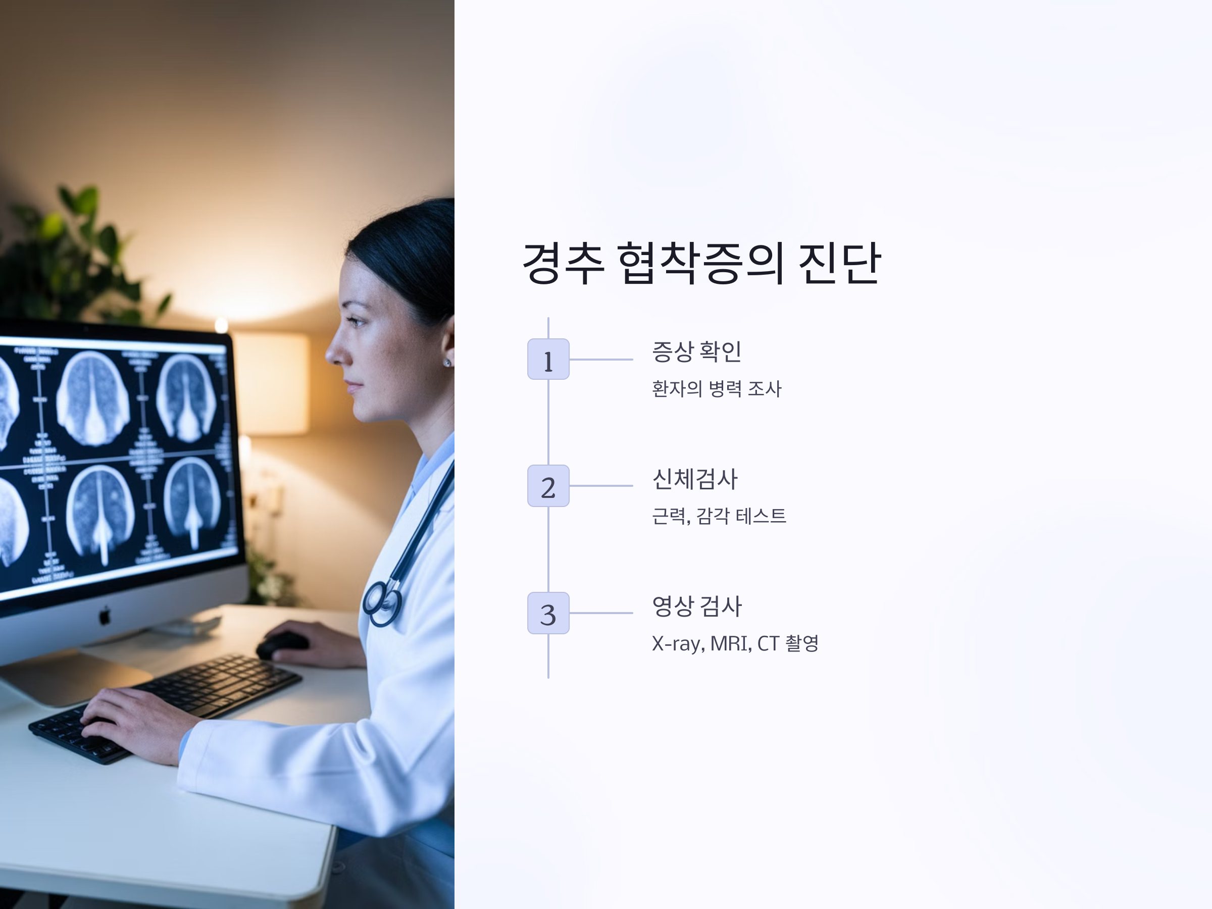 경추 협착증의 진단은 기본적으로 환자의 증상과 병력, 신체검사 등을 토대로 이루어집니다. 진단을 확정하기 위해서는 X-ray, MRI, CT 등 여러 영상 검사를 통해 척추의 상태를 확인해야 합니다. X-ray는 뼈의 변형 상태를 파악하는 데 유용하고, MRI와 CT는 신경 압박 정도를 평가하는 데 도움을 줍니다. 이를 통해 의사는 경추 협착증의 원인과 상태를 정확하게 진단할 수 있습니다.