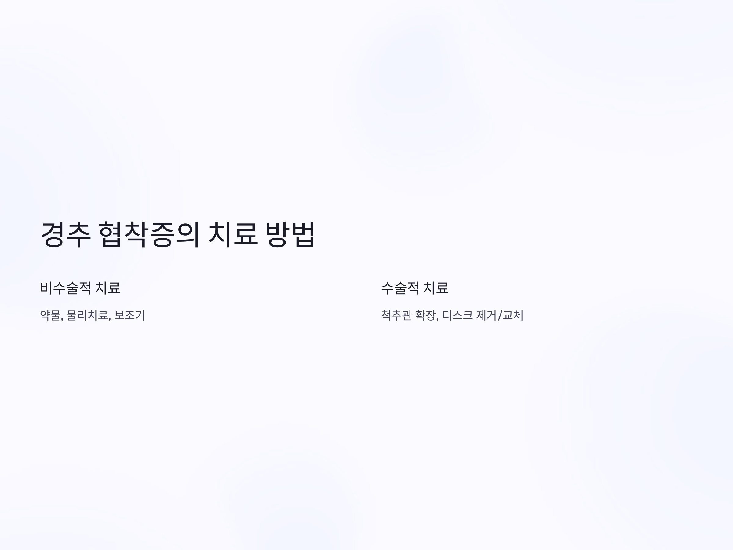 비수술적 치료로 통증이 완화되지 않거나, 신경 손상이 심각한 경우에는 수술적 치료가 필요할 수 있습니다. 수술은 주로 좁아진 척추관을 확장하거나, 디스크를 제거하거나 교체하는 방식으로 이루어집니다. 수술 후에는 재활치료가 중요하며, 빠른 회복을 위해 꾸준한 운동과 관리가 필요합니다.
