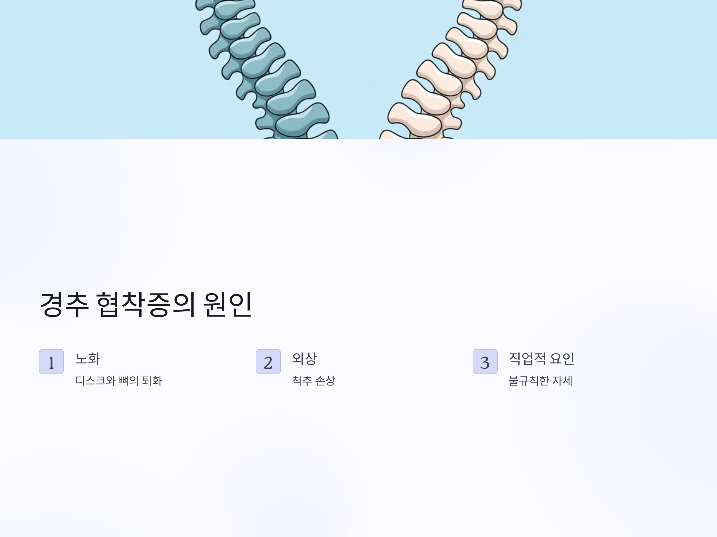 경추 협착증은 주로 노화로 인해 발생하지만, 외상이나 반복적인 자세 문제 등도 영향을 미칠 수 있습니다.