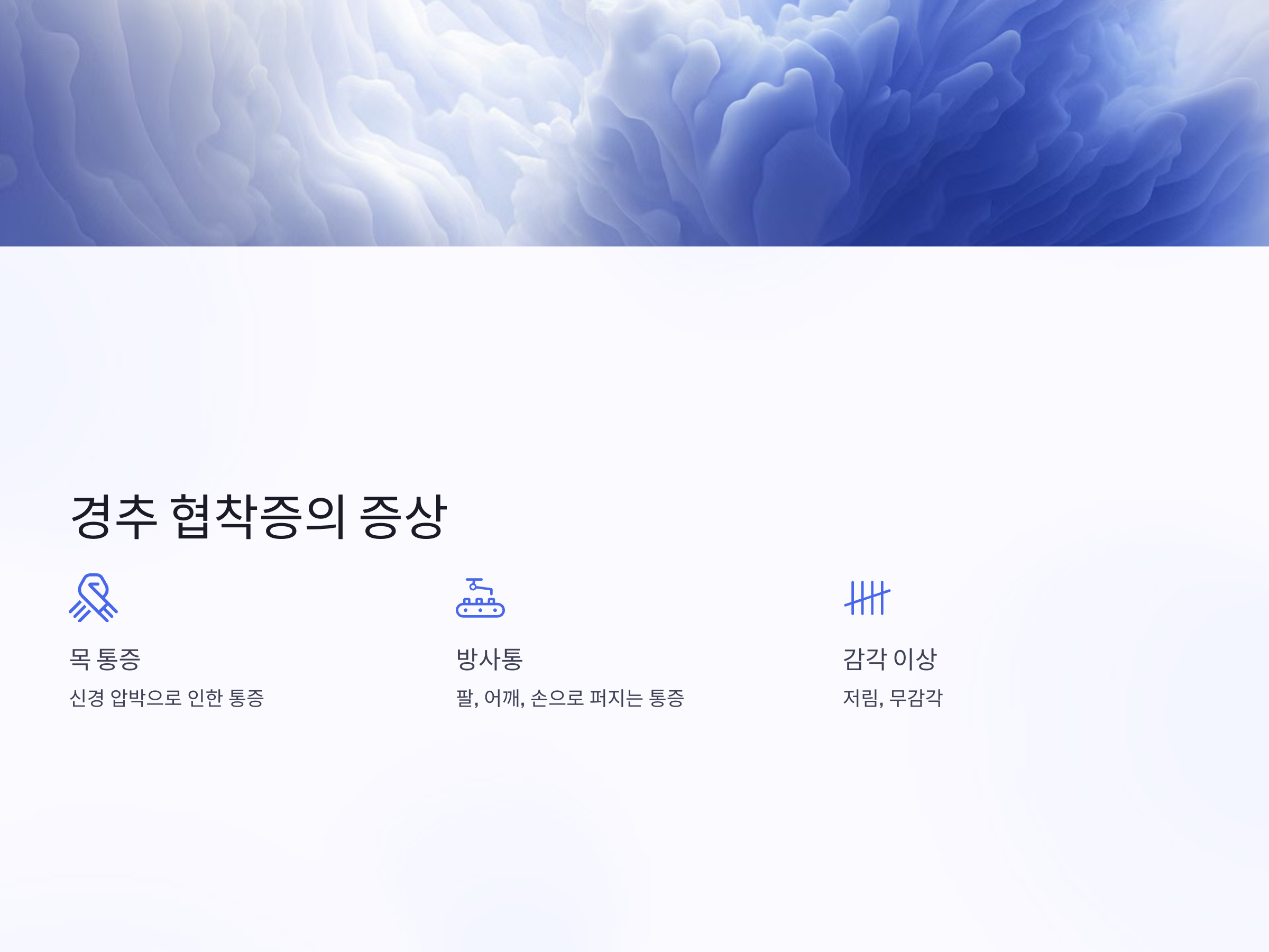 경추 협착증의 가장 대표적인 증상은 목 통증과 방사통입니다. 목 통증은 협착증으로 인해 신경이 압박을 받는 결과로 발생하며, 이를 방치하면 점차 팔, 어깨, 손으로 통증이 퍼질 수 있습니다. 방사통은 신경이 압박될 때 통증이 팔꿈치, 손목, 손끝으로 방사되는 증상입니다. 이 외에도 다음과 같은 증상들이 나타날 수 있습니다.