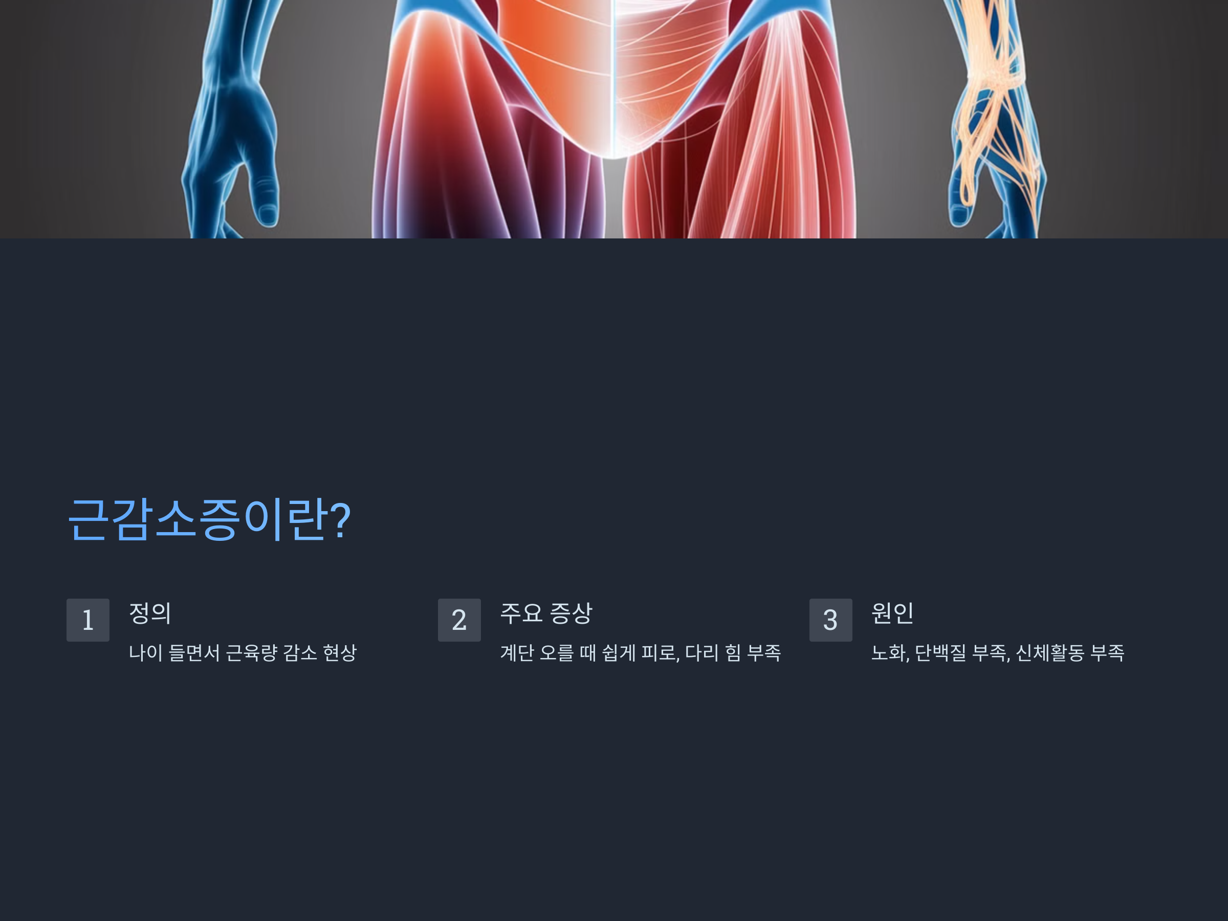근감소증(Sarcopenia)은 나이가 들면서 근육량이 감소하는 현상을 말합니다. 주로 40대 이후부터 시작되며, 적절한 운동과 단백질 섭취가 부족하면 증상이 악화됩니다. 허벅지 근육이 줄어들면 힘이 빠지고 무거운 느낌이 들 수 있습니다.