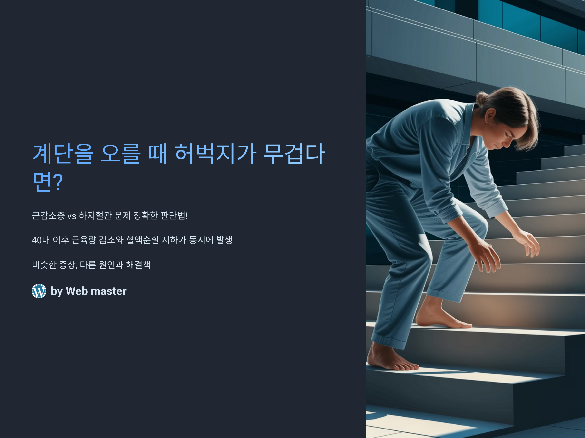 계단을 오를 때 허벅지가 무겁거나 쉽게 피로해진다면 단순한 피로가 아니라 근감소증이나 하지혈관 문제일 가능성이 있습니다. 최근 연구에 따르면 40대 이후 근육량 감소와 혈액순환 저하가 동시에 발생하는 경우가 많아, 이를 구별하고 조기에 대처하는 것이 중요합니다. 두 가지 질환은 비슷한 증상을 보이지만 원인과 해결책이 다르므로, 정확한 판단이 필요합니다. 이번 글에서는 각각의 원인과 특징을 명확히 구분하고, 적절한 대처법을 알려드리겠습니다.