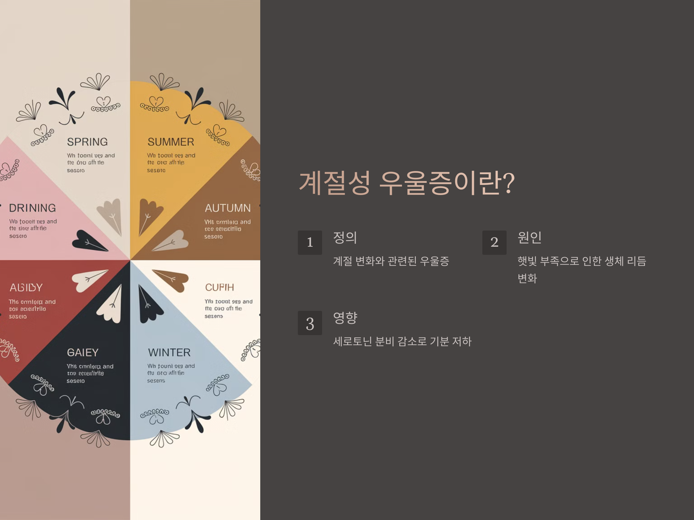 계절성 우울증은 계절의 변화와 관련이 있는 우울증의 한 종류입니다. 특히 겨울철, 일조량이 적은 기간에 발생하는 경향이 있으며, 여름이나 봄처럼 일조량이 많아지는 시기에는 증상이 사라지기도 합니다. 계절성 우울증의 주요 원인은 햇빛 부족으로, 이는 우리의 생체 시계인 서카디언 리듬(Circadian rhythm)에 영향을 미칩니다. 서카디언 리듬은 우리의 수면, 기분, 식욕 등을 조절하는 역할을 합니다.