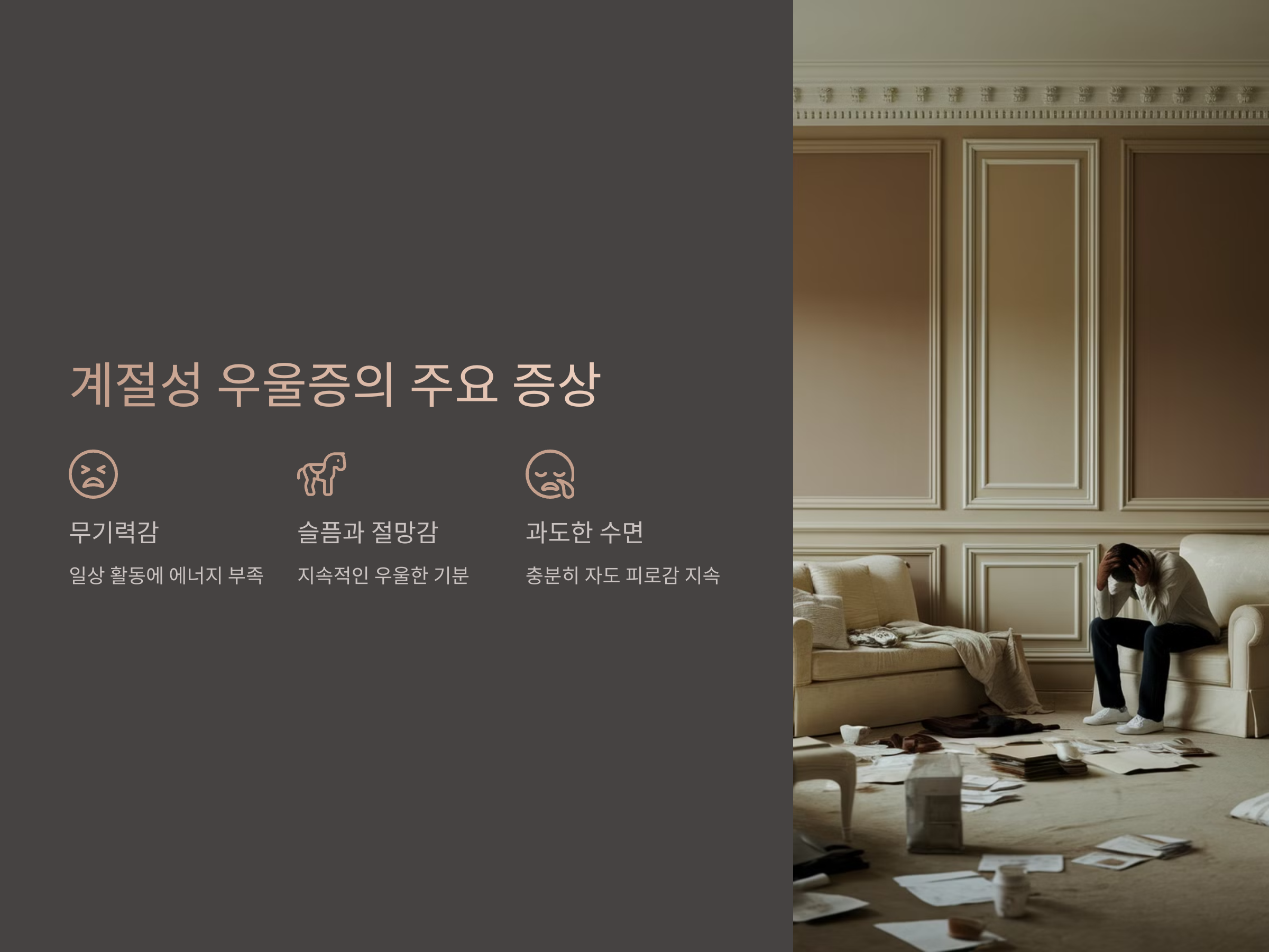 계절성 우울증은 일반적인 우울증과 비슷한 증상을 보이지만, 특정 계절에만 나타나는 특징이 있습니다. 주요 증상으로는 다음과 같습니다:
