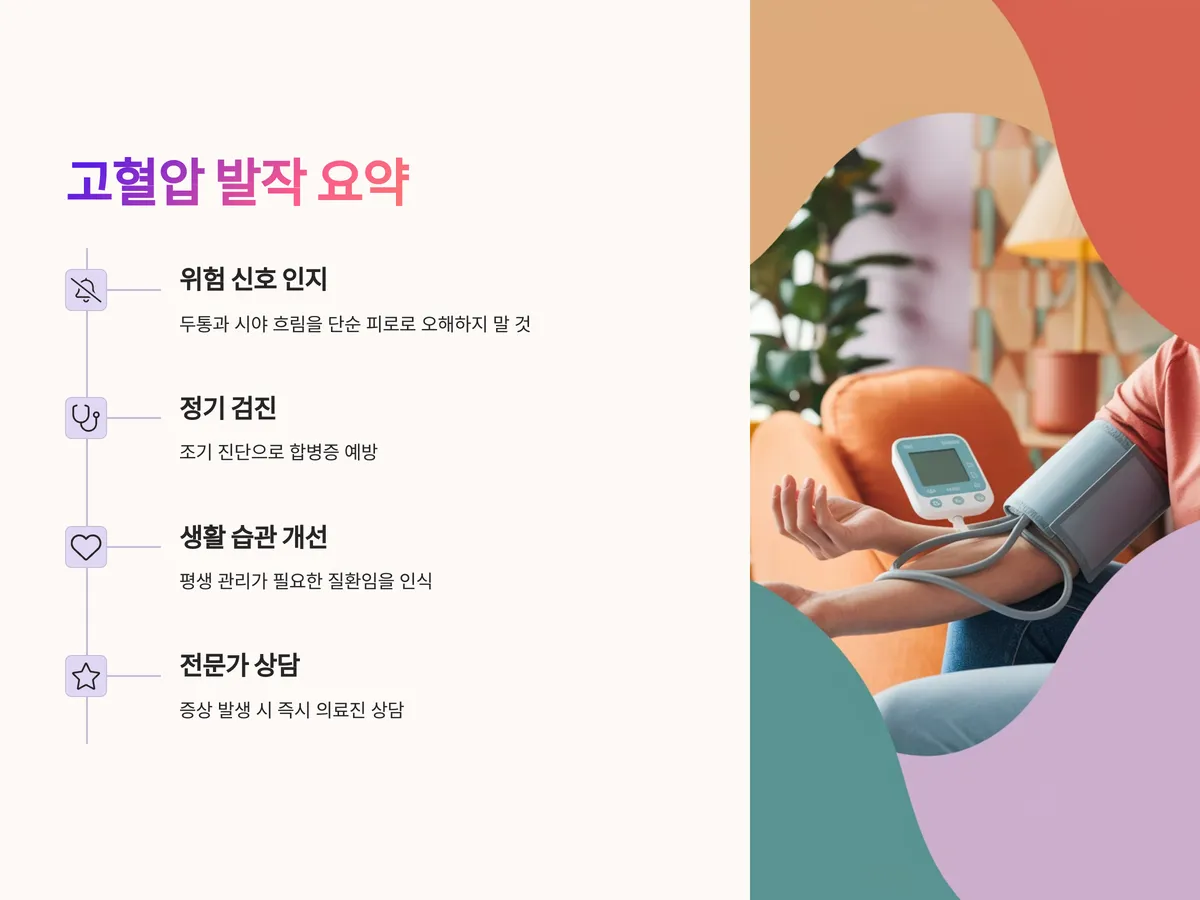 고혈압은 완치보다는 평생 관리해야 할 질환입니다. 따라서 미리 생활습관을 개선하고 꾸준히 관리하는 것이 가장 중요합니다. 다음은 고혈압 발작 예방을 위한 핵심 관리 팁입니다: