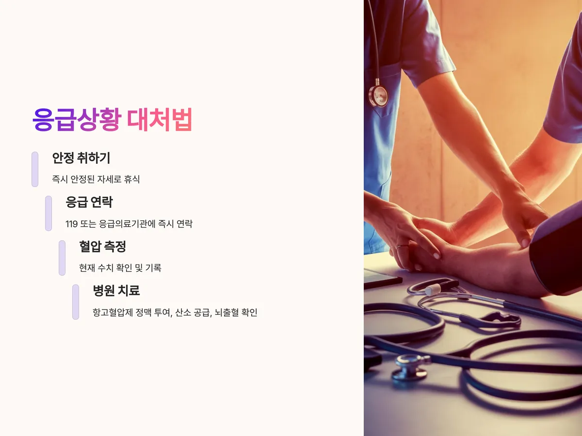 응급 상황에서 병원에 도착하면, 의료진은 혈압 안정화를 위한 항고혈압제 정맥 투여나 산소 공급, 필요한 경우 뇌출혈 여부 확인 등을 진행하게 됩니다. 이처럼 빠른 대응은 생명을 구할 수 있으며, 후유증도 최소화할 수 있습니다.