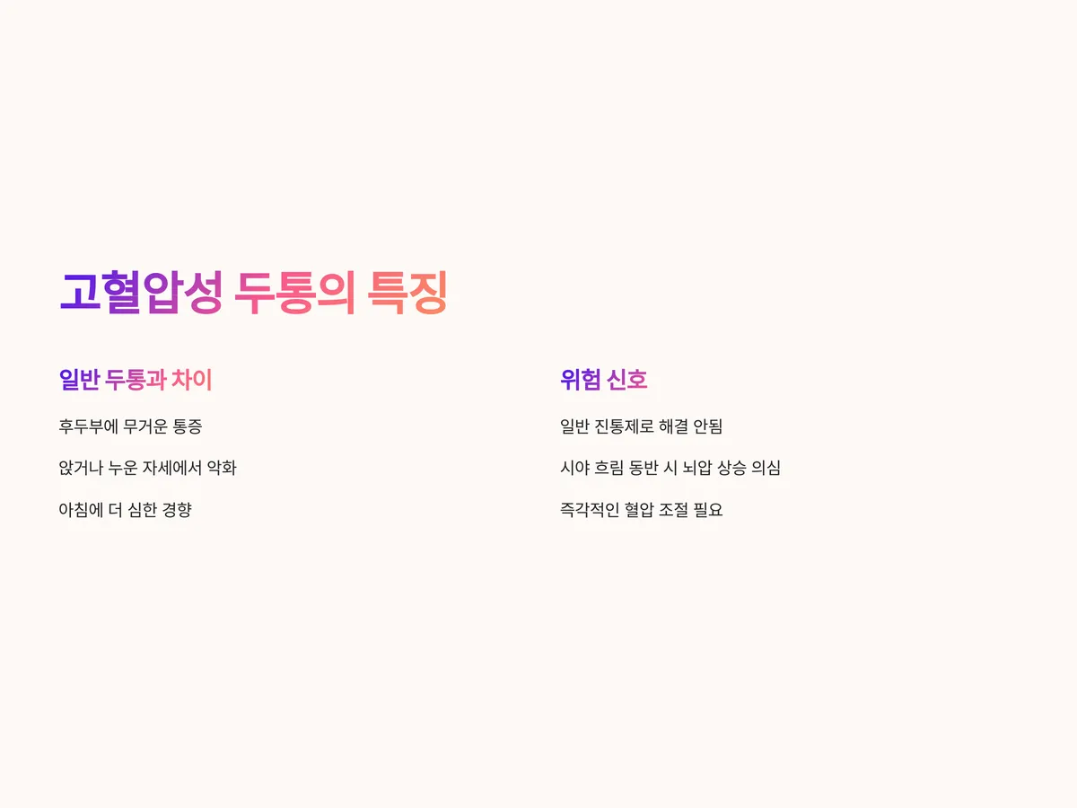 고혈압으로 인한 두통은 일반적인 긴장성 두통이나 편두통과는 양상과 강도가 다릅니다. 주로 후두부 쪽에서 무거운 통증이 지속되며, 앉거나 누운 자세에서 더 심해지는 경향이 있습니다. 특히 아침에 일어났을 때 머리가 무겁고 어지럽다면, 수면 중 혈압 상승이 있었을 가능성이 큽니다.