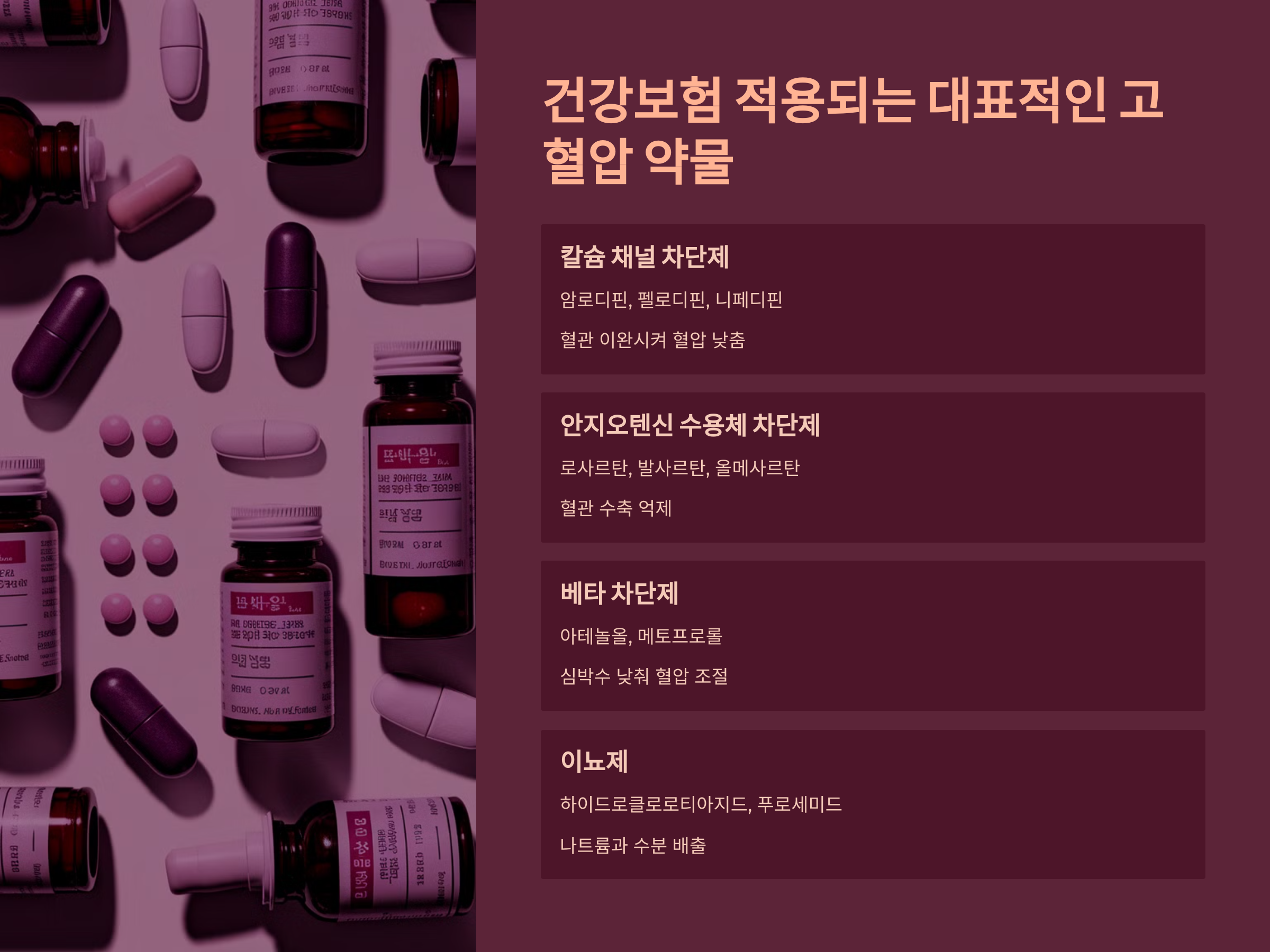 현재 건강보험 급여가 적용되는 대표적인 고혈압 치료제는 다음과 같습니다.