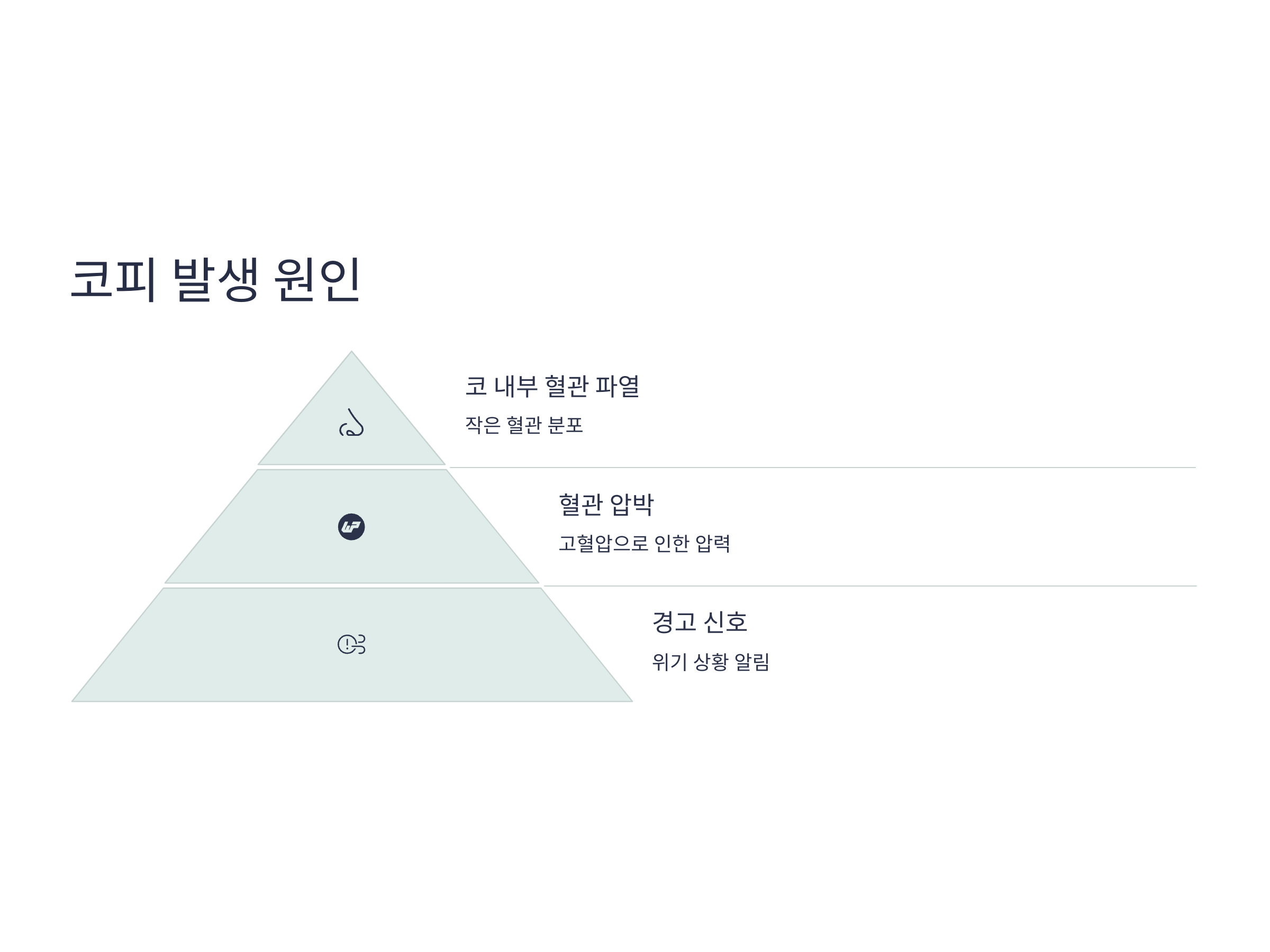 고혈압 위기 시 코피가 나는 이유는 혈압이 지나치게 높아져 코 내부의 혈관이 파열되기 때문입니다. 코는 매우 많은 작은 혈관들이 분포해 있는 부위로, 고혈압이 갑자기 상승하면 이 혈관들이 압박을 받아 터질 수 있습니다. 이러한 코피는 대개 고혈압이 급격히 상승한 상태에서 발생하며, 혈관에 가해지는 압력이 높을수록 코피가 자주 발생할 수 있습니다.