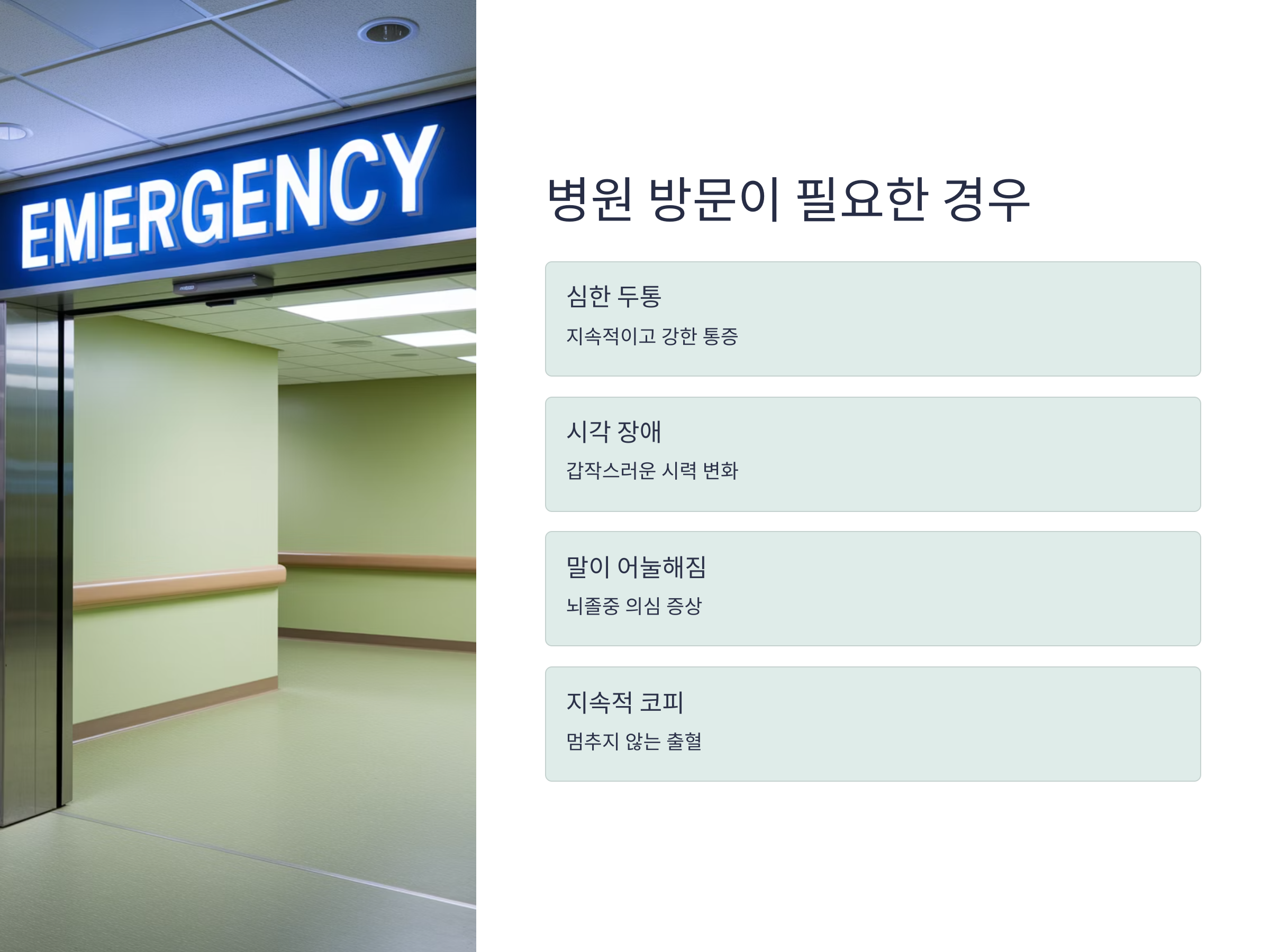 특히 고혈압 위기는 뇌졸중과 같은 치명적인 질환을 유발할 수 있는 상태이기 때문에 두통이 동반될 경우 신속한 대처가 필요합니다. 만약 두통이 심하고 지속되며, 갑작스러운 시각 장애나 말이 어눌해지는 증상이 동반된다면 즉시 병원을 찾아야 합니다.