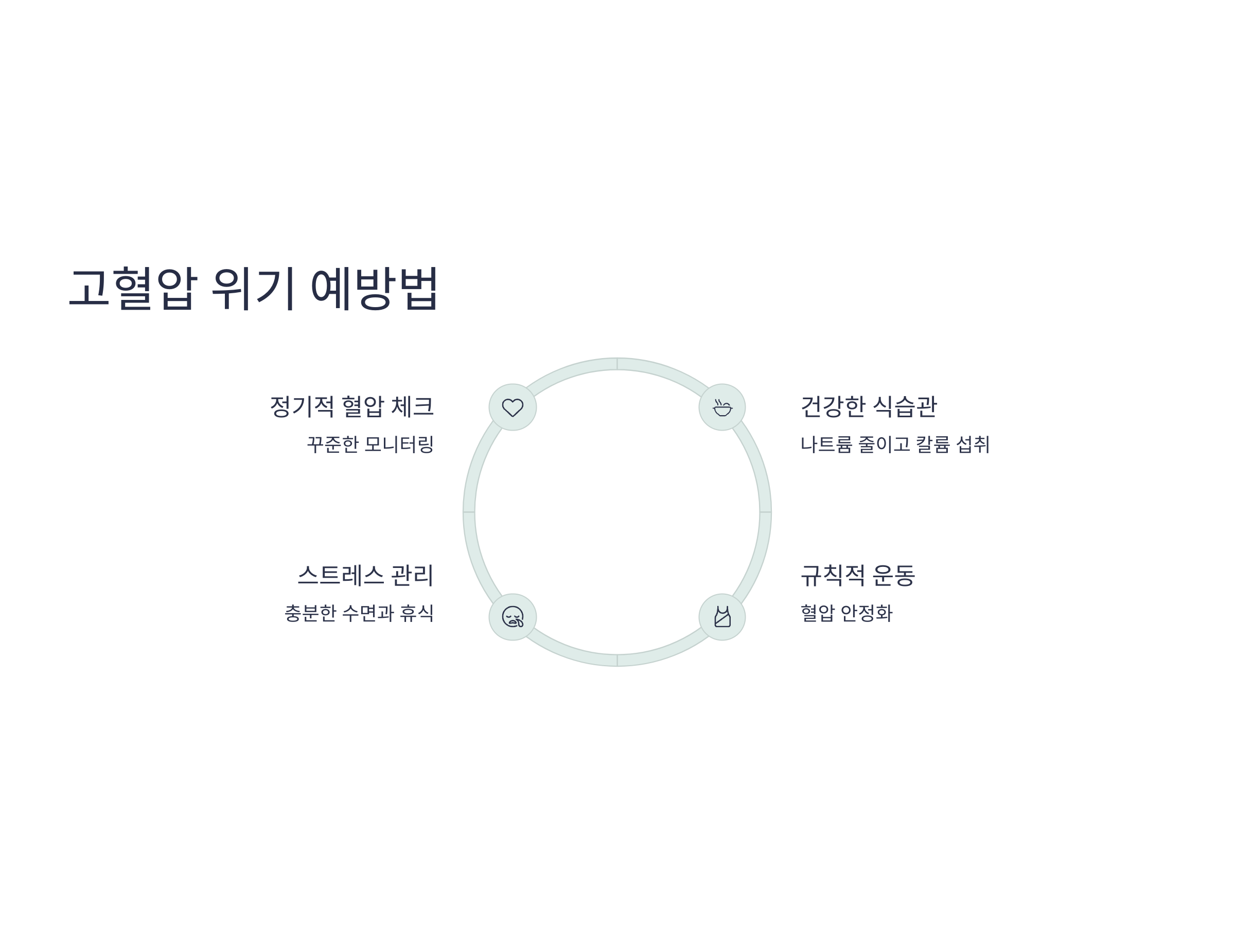 고혈압 위기를 예방하기 위해서는 꾸준한 관리와 생활습관의 개선이 필요합니다. 먼저, 정기적인 혈압 체크는 고혈압을 관리하는 첫 번째 단계입니다. 또한, 식습관 개선과 함께 규칙적인 운동을 통해 혈압을 안정적으로 유지할 수 있습니다. 스트레스를 최소화하고, 적절한 수면을 취하는 것도 중요한 예방책이 됩니다.