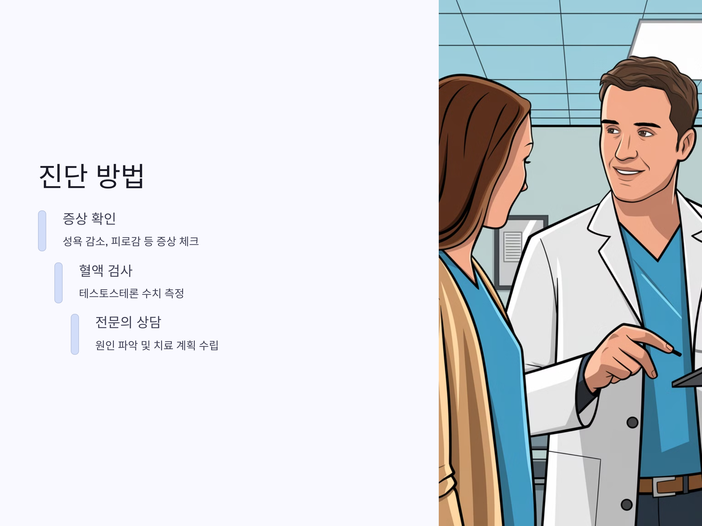 고환 기능 저하는 혈액 검사를 통해 진단할 수 있습니다. 특히, 혈액 내 테스토스테론 수치를 측정하는 것이 중요한데, 정상적인 범위에서 벗어난 수치는 고환 기능 저하를 나타낼 수 있습니다. 또한, 의사는 호르몬 불균형이나 스트레스와 관련된 다른 요인들도 함께 평가하여 원인을 파악할 수 있습니다.