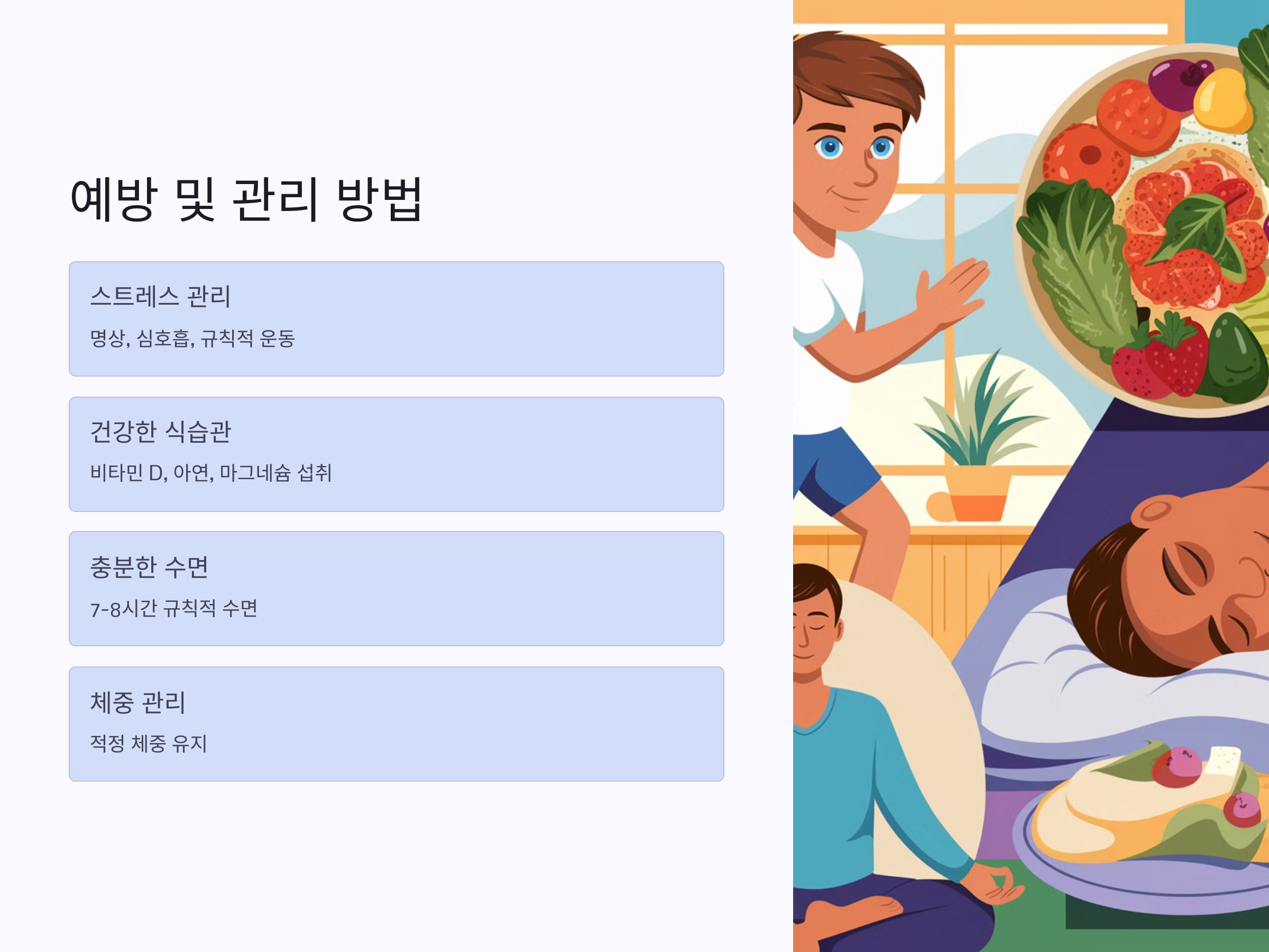 고환 기능 저하를 예방하기 위해서는 몇 가지 중요한 생활 습관을 개선하는 것이 필요합니다. 첫째, 스트레스를 줄이기 위한 방법을 찾는 것이 중요합니다. 규칙적인 운동, 명상, 심호흡 등의 스트레스 관리 기법은 코르티솔 수치를 낮추고, 호르몬 균형을 맞추는 데 도움이 됩니다. 둘째, 건강한 식습관을 유지하는 것이 중요합니다. 비타민 D, 아연, 마그네슘 등은 테스토스테론 생성에 중요한 역할을 하므로, 이를 충분히 섭취하는 것이 필요합니다.