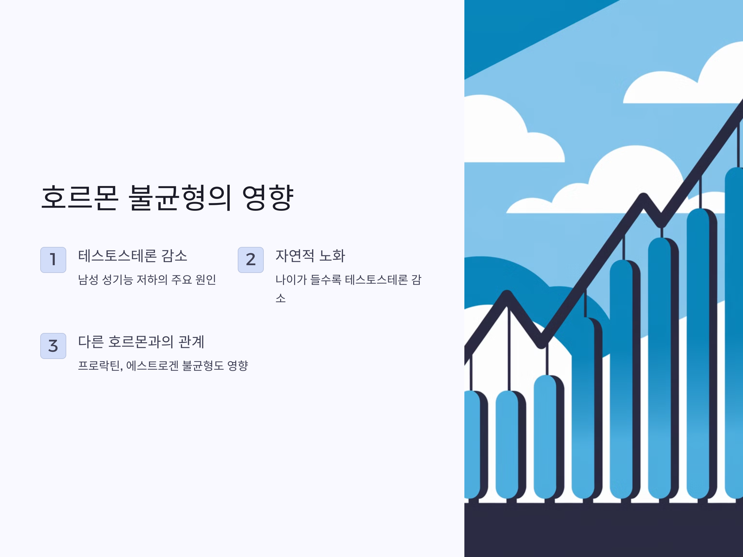 호르몬 불균형은 고환 기능 저하의 가장 큰 원인 중 하나입니다. 고환은 남성 호르몬인 테스토스테론을 생성하고, 이 호르몬은 남성의 성적 기능과 관련이 깊습니다. 그러나 고환의 기능이 저하되면 테스토스테론의 생성이 줄어들어 여러 가지 신체적, 정신적 증상이 발생할 수 있습니다. 특히, 나이가 들면서 남성의 테스토스테론 수치는 자연스럽게 감소하는데, 이는 고환 기능 저하의 주요 원인 중 하나입니다. 또한, 고환 자체에 질병이 발생하거나, 외상 등의 이유로 고환 기능이 저하될 수 있습니다.