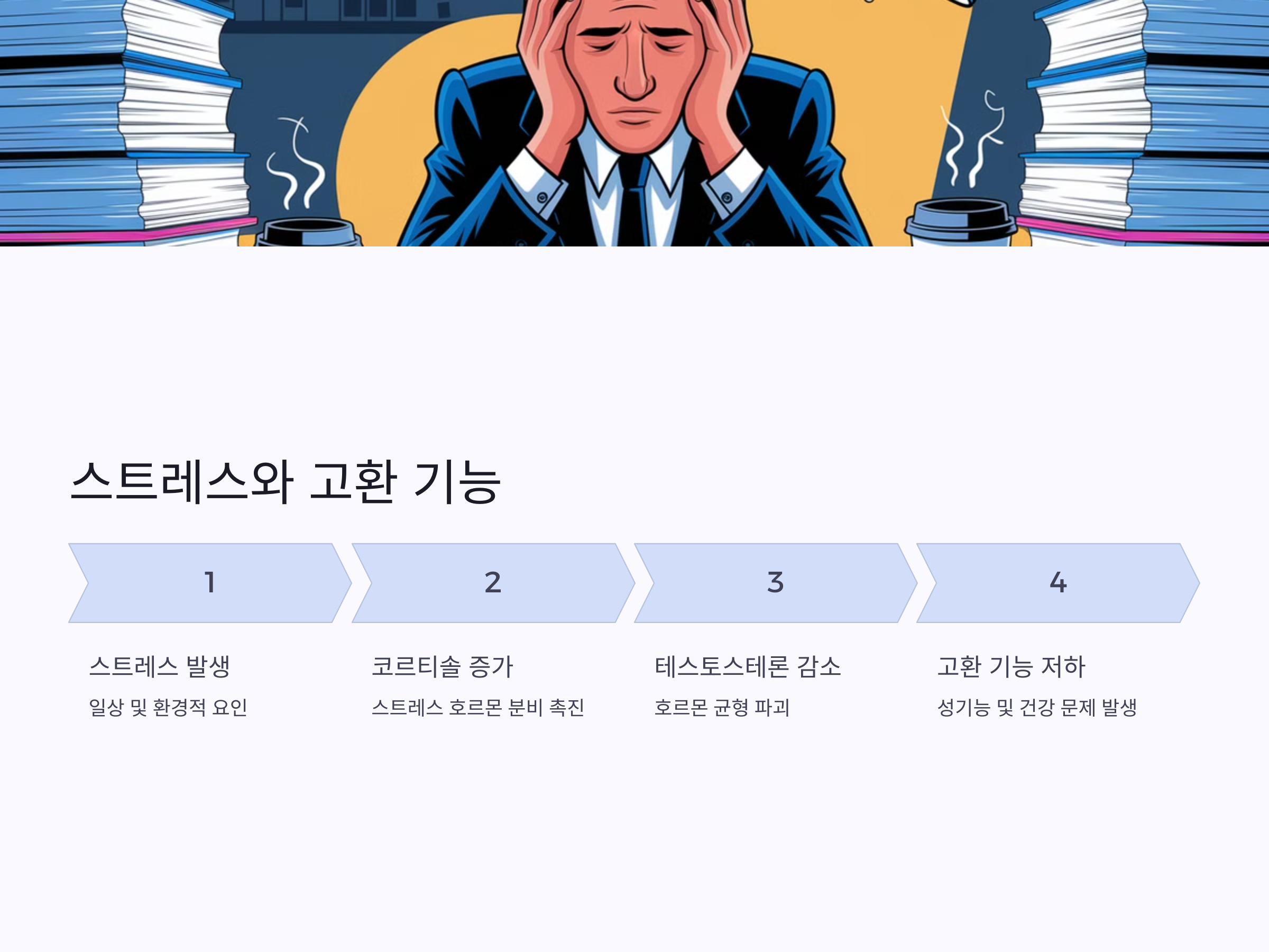 스트레스가 지속되면 코르티솔 수치가 계속해서 상승하고, 이로 인해 테스토스테론 수치가 감소하게 됩니다. 높은 코르티솔 수치는 성욕 저하, 피로, 우울증 등의 증상을 유발하며, 이는 고환 기능에 직접적인 영향을 미칩니다. 또한, 스트레스는 체내 염증을 증가시켜 고환에 추가적인 부담을 주며, 기능 저하를 더욱 심화시킬 수 있습니다.