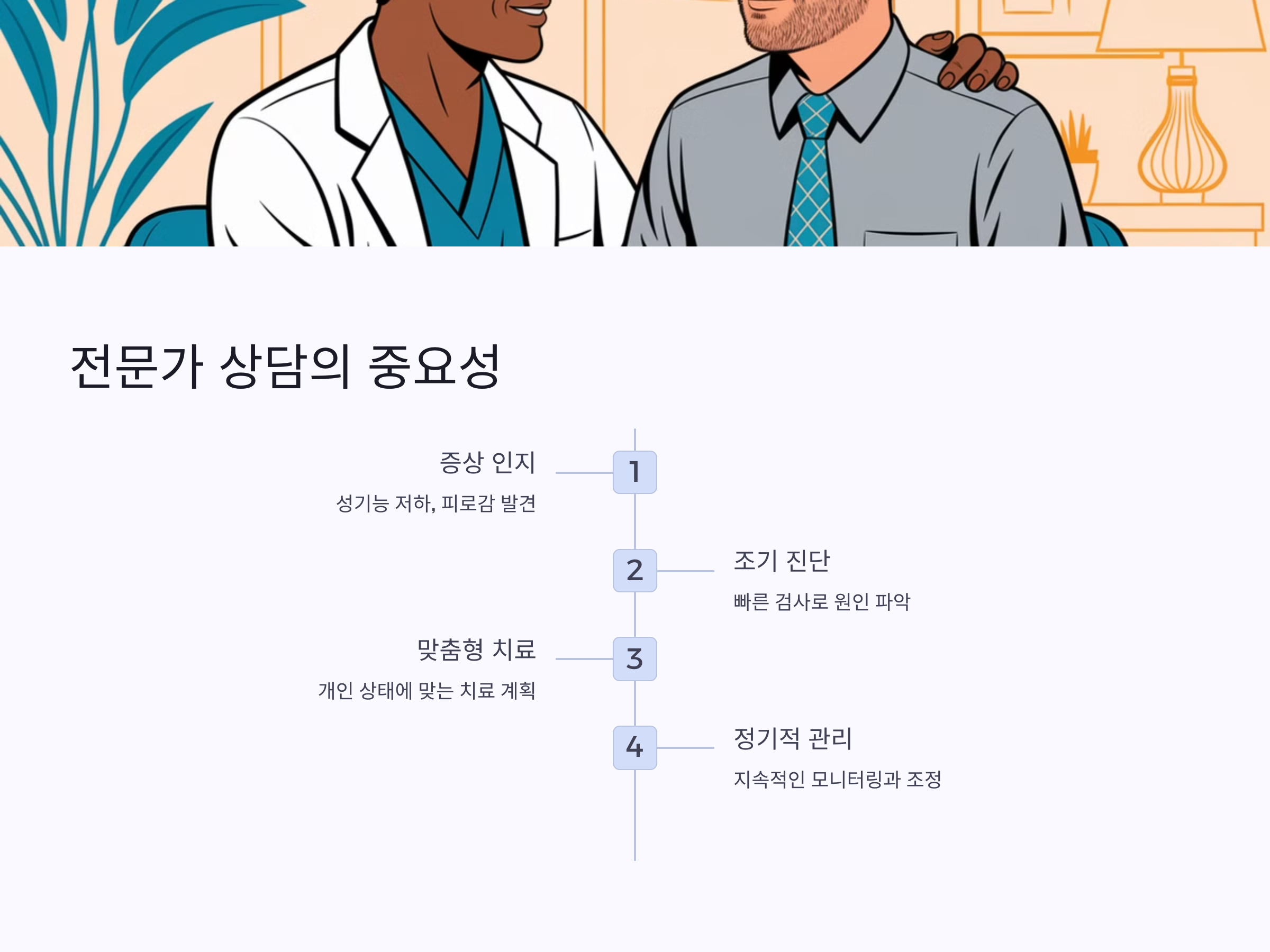 고환 기능 저하가 의심되는 경우, 여러 가지 증상이 나타날 수 있습니다. 주요 증상으로는 성욕 감소, 발기부전, 피로감, 우울감, 근육량 감소 등이 있습니다. 이 외에도 체중 증가, 수면 문제, 집중력 저하 등의 증상이 함께 나타날 수 있습니다. 이러한 증상들이 나타난다면, 호르몬 불균형이나 스트레스 등으로 인한 고환 기능 저하를 의심할 수 있습니다.