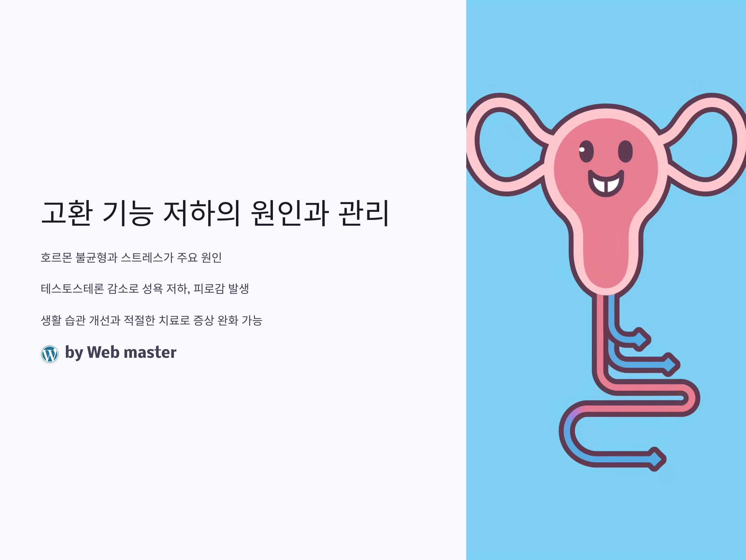 고환 기능 저하는 호르몬 불균형과 스트레스 등 여러 원인에 의해 발생할 수 있으며, 이는 성적 건강과 전반적인 웰빙에 영향을 미칩니다. 고환 기능 저하를 예방하기 위해서는 스트레스 관리, 건강한 식습관, 충분한 수면 등의 생활 습관 개선이 중요합니다. 또한, 호르몬 불균형이나 스트레스가 고환 기능에 미치는 영향을 인식하고, 필요한 경우 전문가의 도움을 받는 것이 좋습니다. 고환 기능 저하가 의심될 경우 빠르게 진단을 받고, 적절한 치료를 시작하는 것이 중요합니