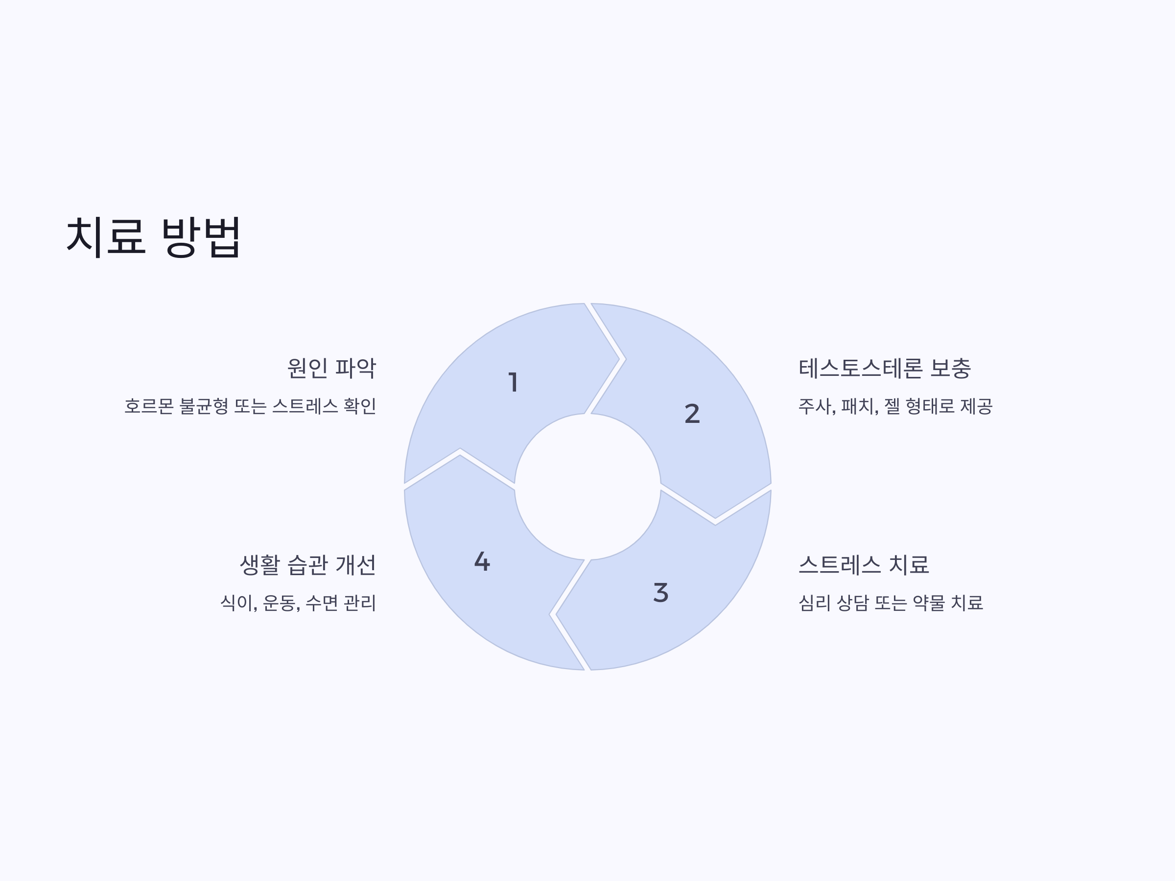 고환 기능 저하에 대한 치료는 원인에 따라 달라질 수 있습니다. 호르몬 불균형이 원인이라면, 테스토스테론 보충 요법이 필요할 수 있습니다. 이는 의사의 처방에 따라 진행되며, 주사, 패치, 젤 등의 형태로 테스토스테론을 보충할 수 있습니다. 또한, 스트레스를 관리하는 것도 중요한 치료 방법 중 하나입니다. 스트레스가 심각한 경우, 심리적 치료나 약물 치료가 필요할 수도 있습니다.