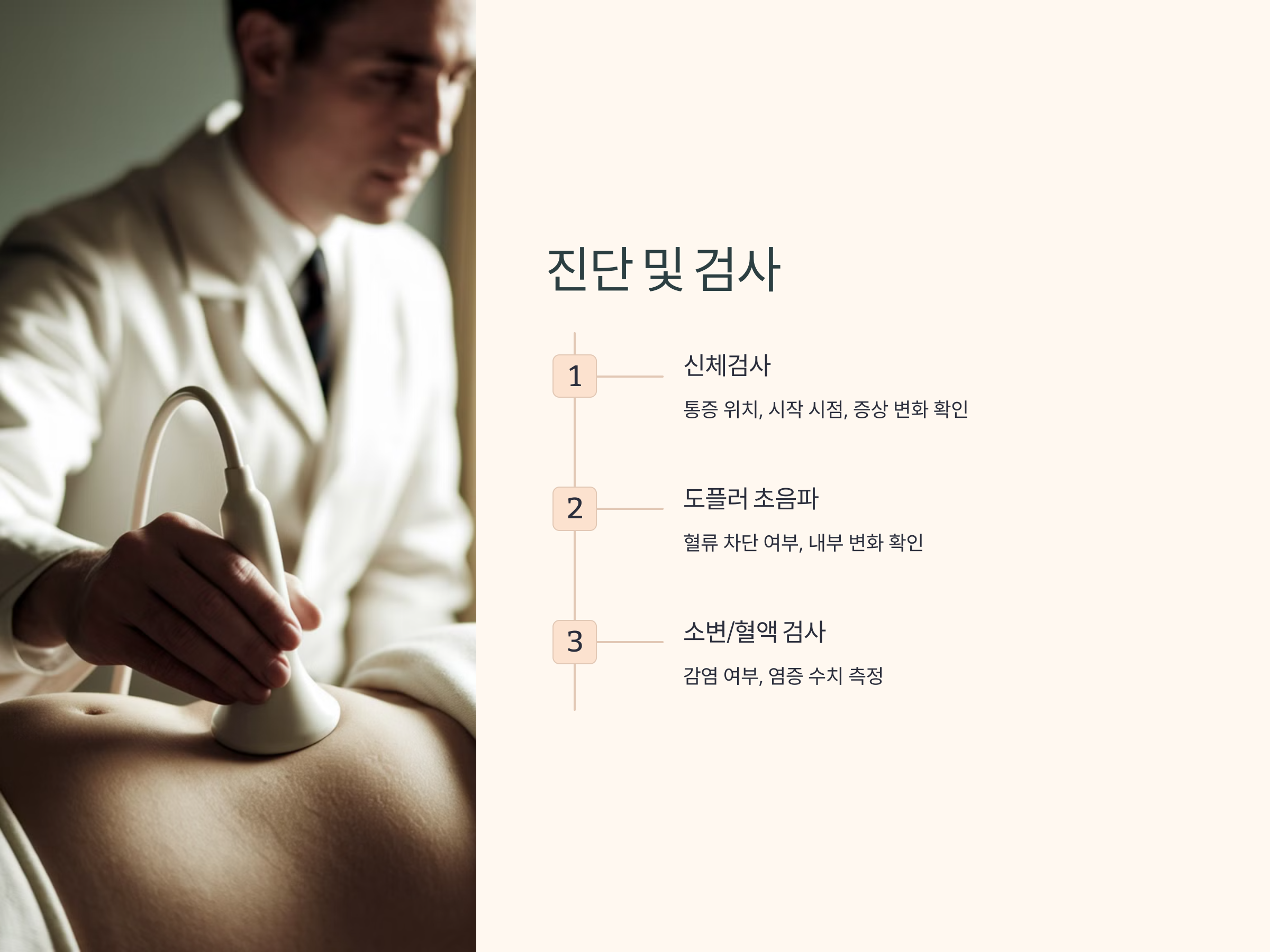 고환 비틀림은 빠른 진단과 치료가 중요합니다. 병원에서 시행하는 대표적인 진단 방법은 다음과 같습니다.