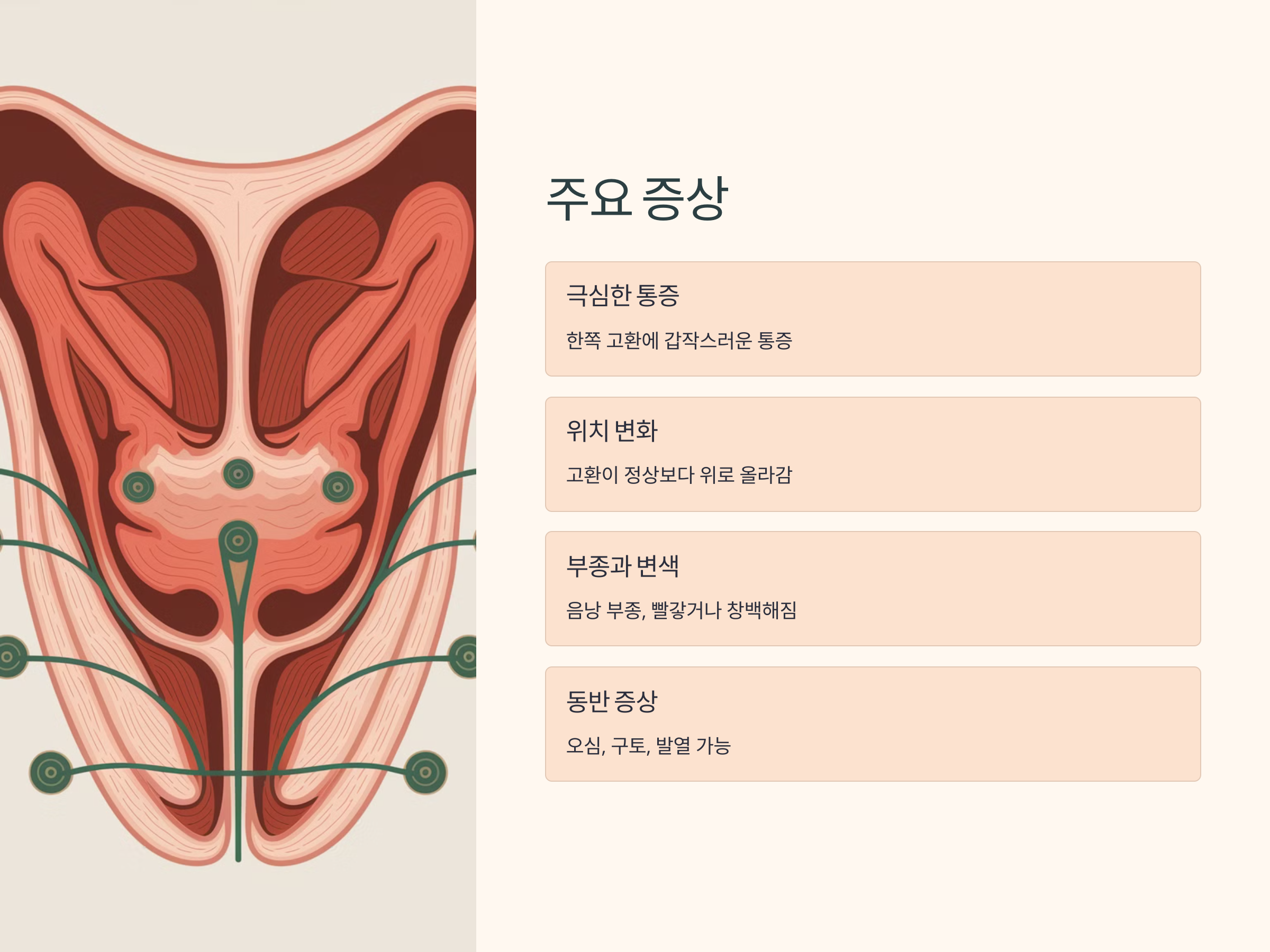 - 한쪽 고환에 극심한 통증 (보통 갑자기 시작됨)