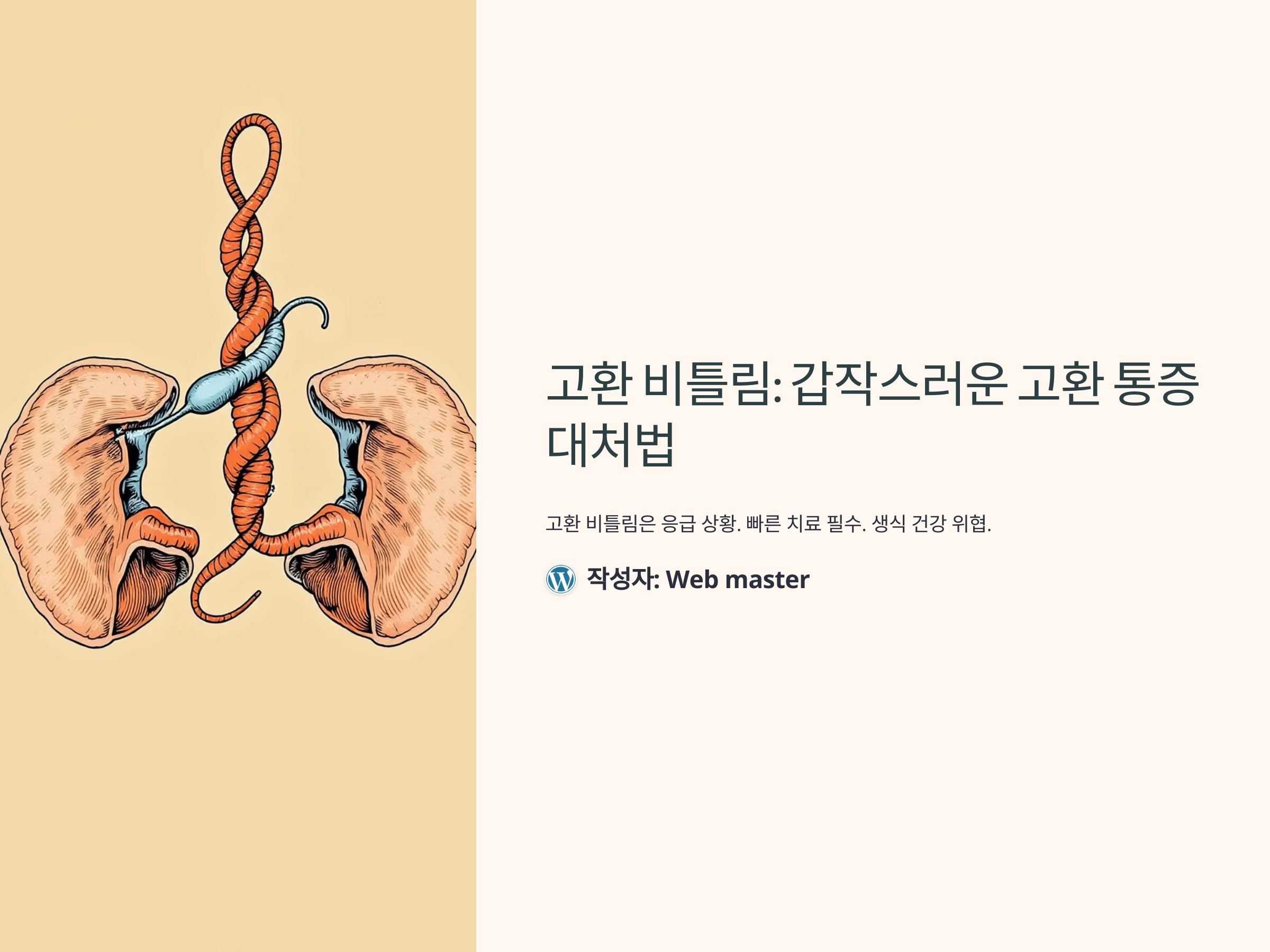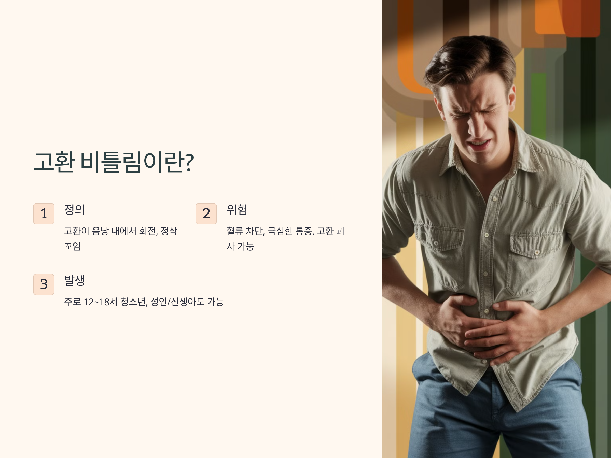 갑작스럽게 고환에 통증이 발생했다면, 절대 무시해서는 안 됩니다. 특히 한쪽 고환이 심하게 아프면서 붓거나 위치가 변한 것처럼 느껴진다면 '고환 비틀림'(고환 염전)을 의심해야 합니다. 이 상태는 고환으로 가는 혈류가 차단되는 응급 상황으로, 빠르게 치료하지 않으면 고환이 괴사할 위험이 있습니다. 고환 비틀림의 원인, 증상, 치료 방법을 정확히 알아두어야 생식 건강을 지킬 수 있습니다.