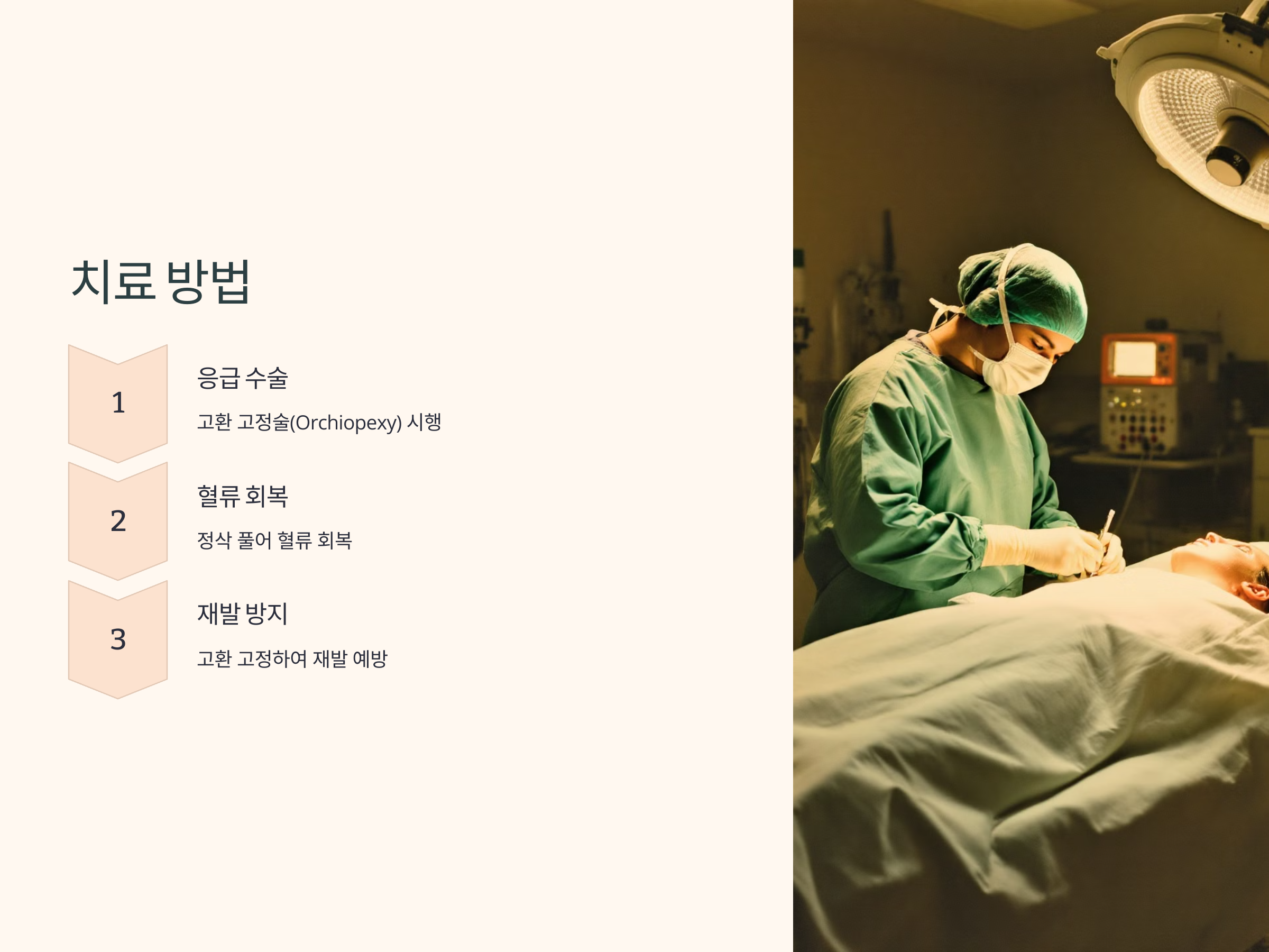 - 정삭을 풀어 혈류를 회복한 후, 고환을 고정하여 재발을 방지