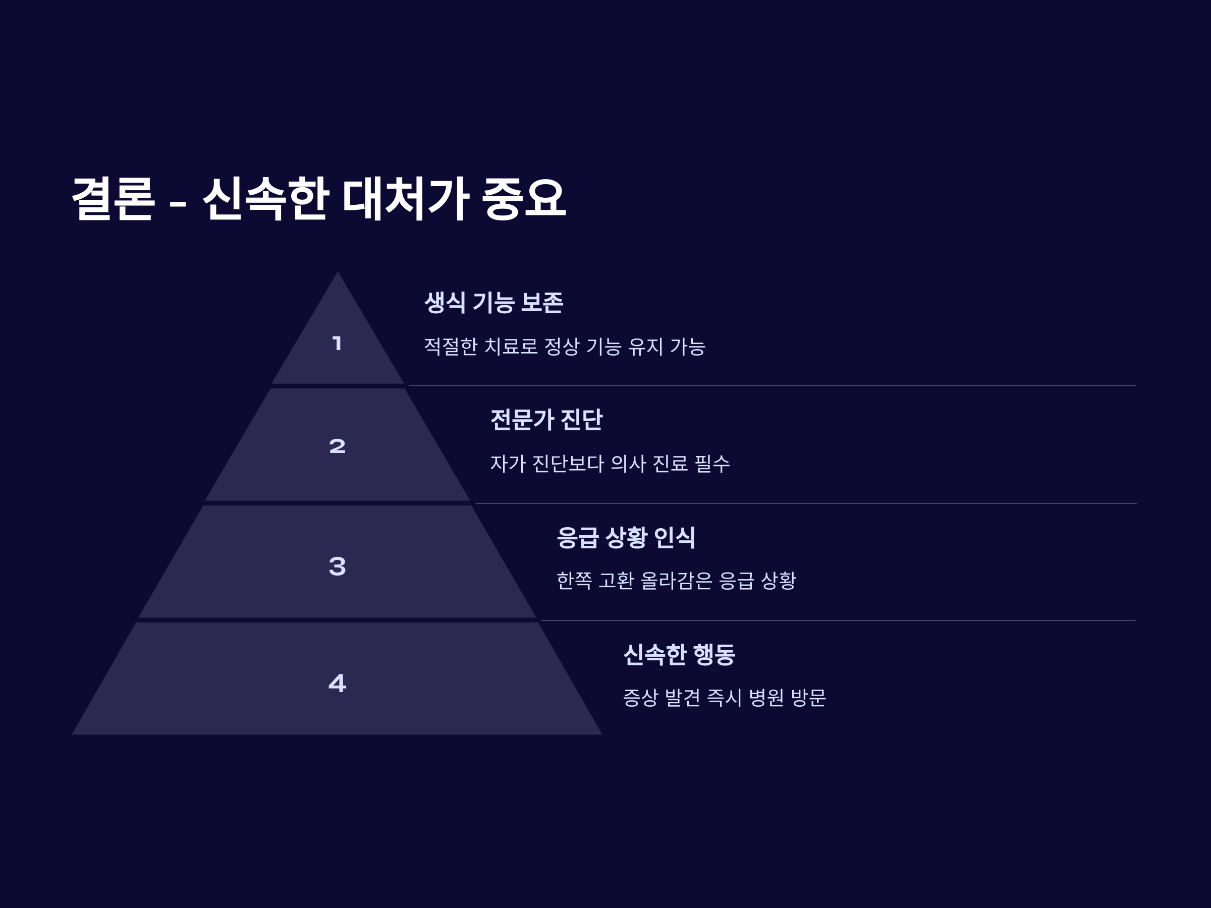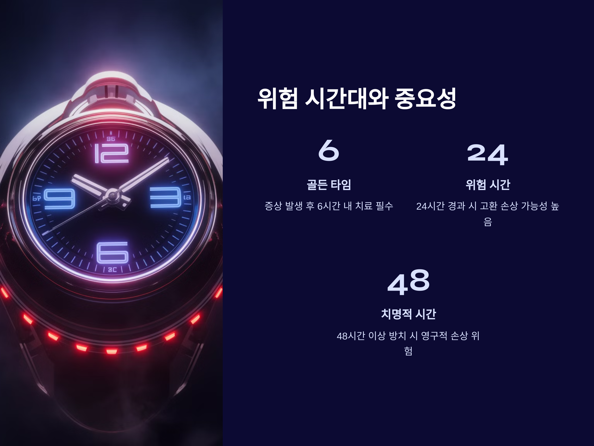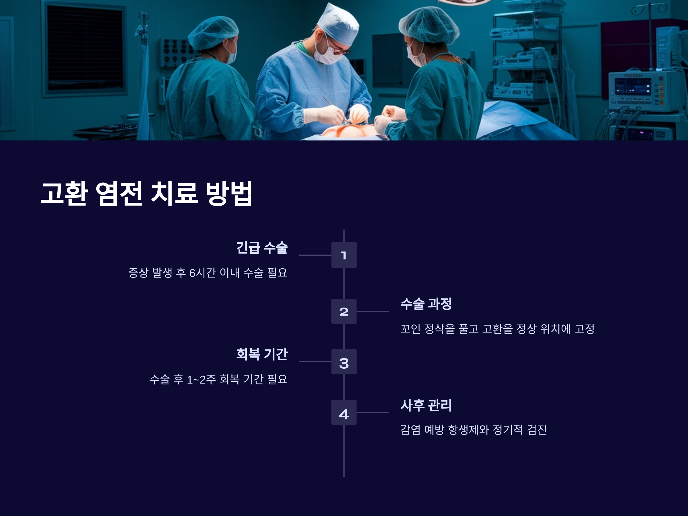 이러한 증상이 나타날 경우 즉시 병원에 방문해야 합니다. 치료가 늦어질수록 혈액 공급이 차단된 고환 조직이 괴사할 가능성이 높아지므로, 빠른 진단과 치료가 필수적입니다.