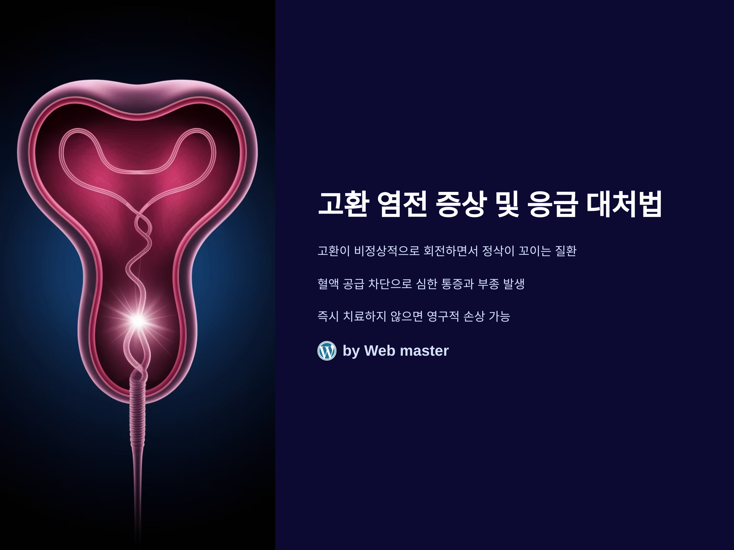 고환 염전(고환 꼬임)은 고환이 비정상적으로 회전하면서 정삭(고환으로 가는 혈관과 신경 조직)이 꼬이는 질환입니다. 이로 인해 혈액 공급이 차단되면서 심한 통증과 부종이 발생할 수 있습니다. 특히 한쪽 고환이 비정상적으로 위로 올라가거나 기울어지는 증상이 나타나면 응급 상황일 가능성이 높습니다. 고환 염전은 즉시 치료하지 않으면 고환 기능이 영구적으로 손상될 수 있어, 신속한 병원 방문이 필수적입니다.