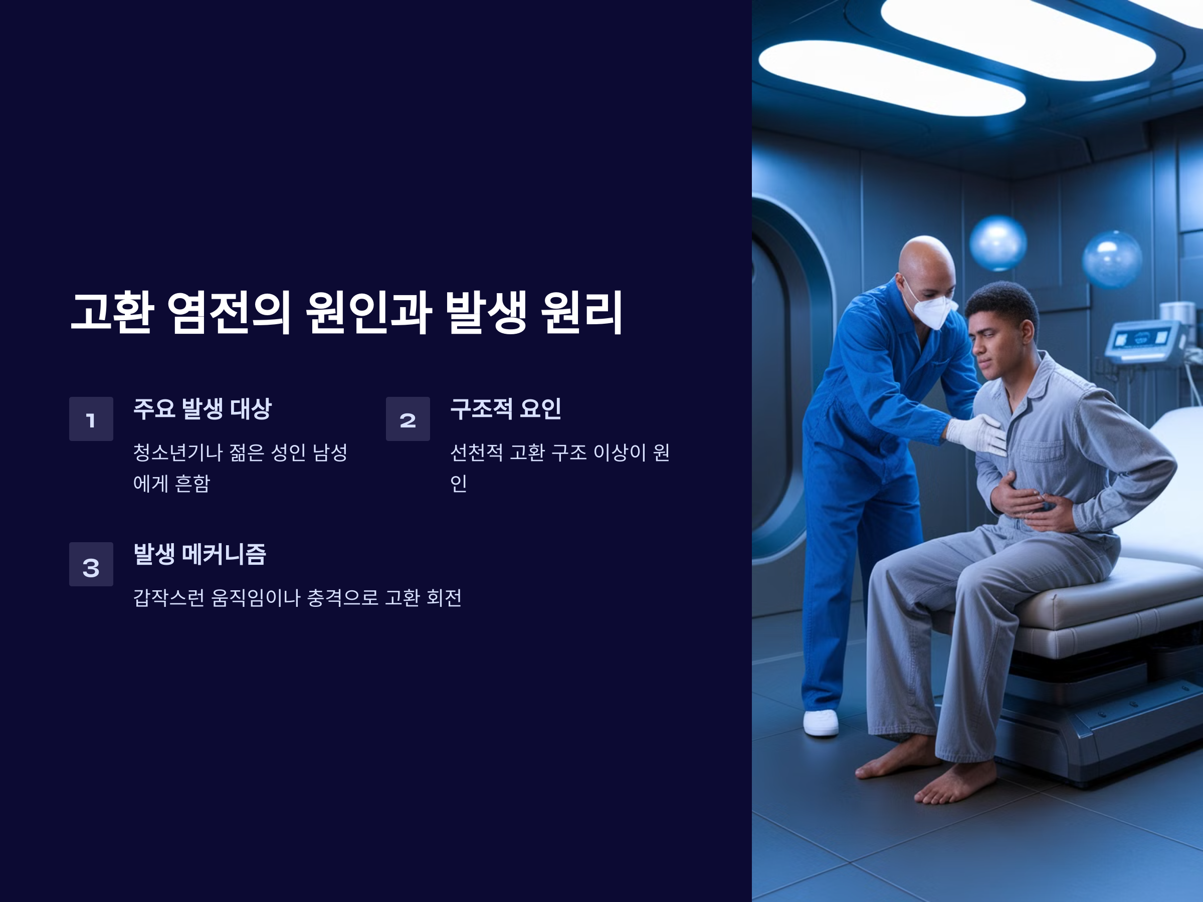 고환 염전은 주로 청소년기나 젊은 성인 남성에게서 많이 발생하며, 선천적인 고환 구조 이상이 원인일 수 있습니다. 일반적으로 고환은 음낭 내에서 적절한 위치에 고정되어 있어야 하지만, 일부 남성의 경우 고환이 자유롭게 움직일 수 있는 구조적 결함이 존재합니다. 이런 경우 갑작스러운 움직임이나 외부 충격으로 인해 고환이 회전하면서 정삭이 꼬일 수 있습니다.
