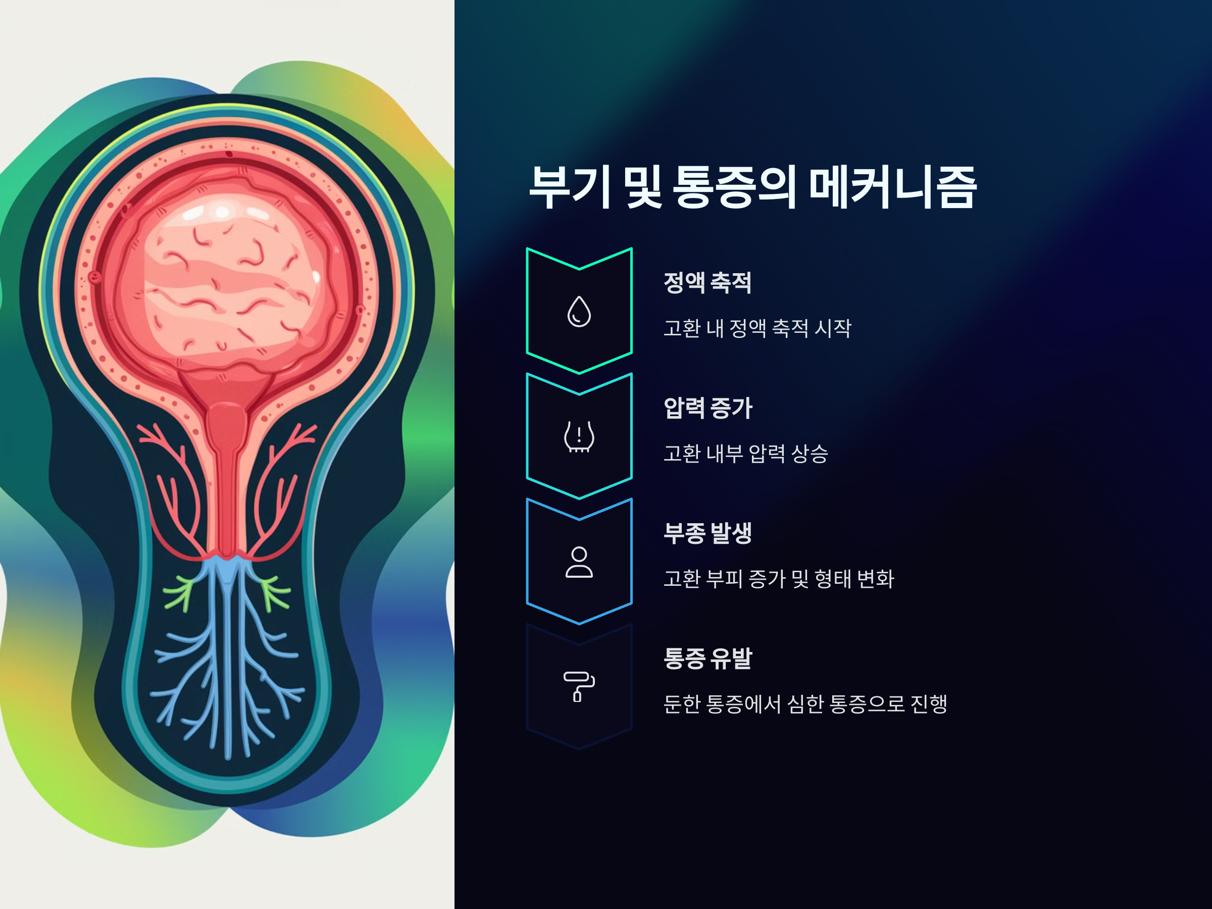 정액이 고환에 축적되면, 정상적인 순환과 배출 과정이 방해받게 되어 부종이 생깁니다. 또한, 이 축적된 정액이 고환을 압박하게 되면서 통증을 유발할 수 있습니다. 이때 발생하는 통증은 보통 둔한 느낌의 통증으로 시작하여, 시간이 지나면서 점차 심해질 수 있습니다.