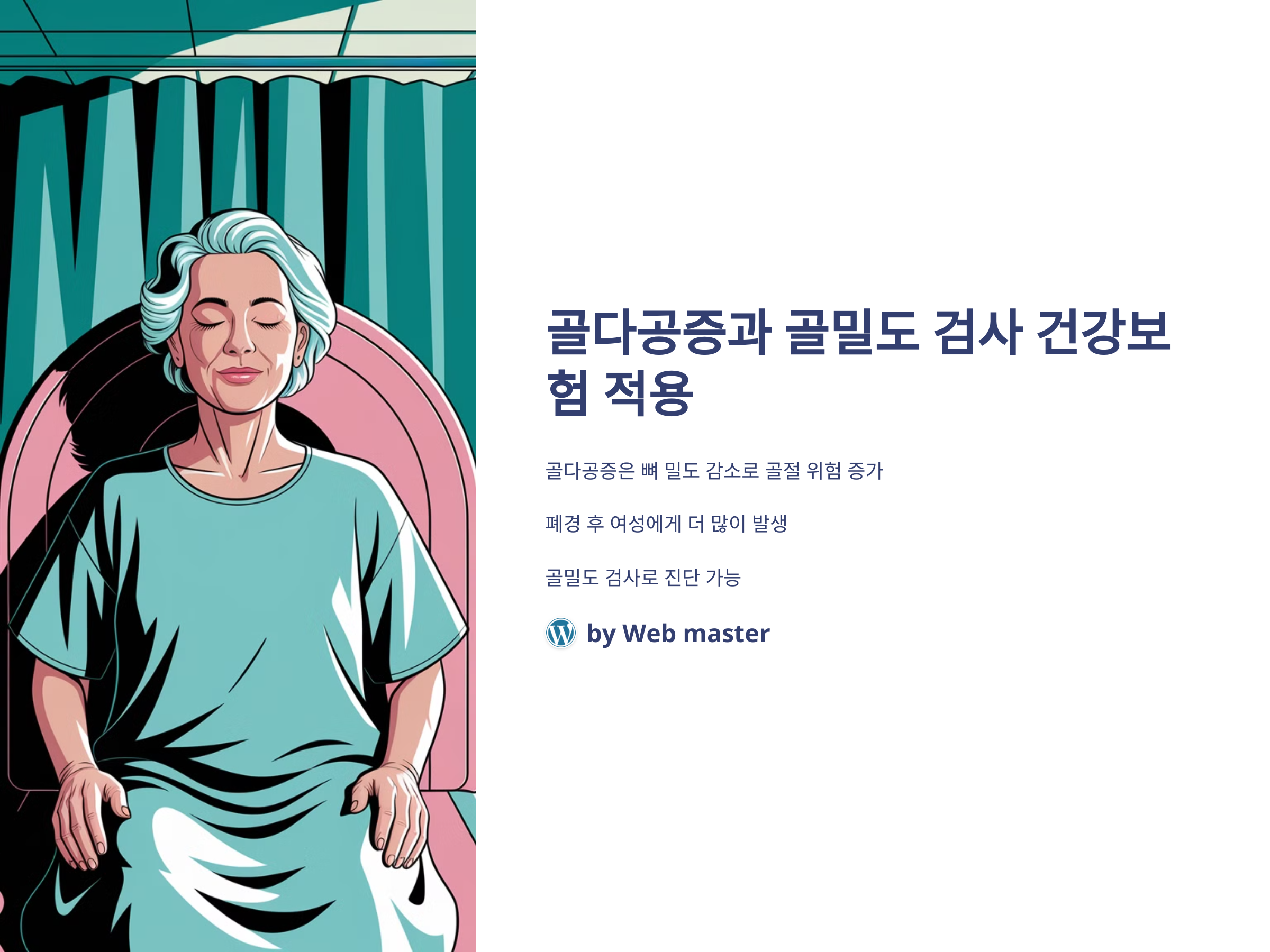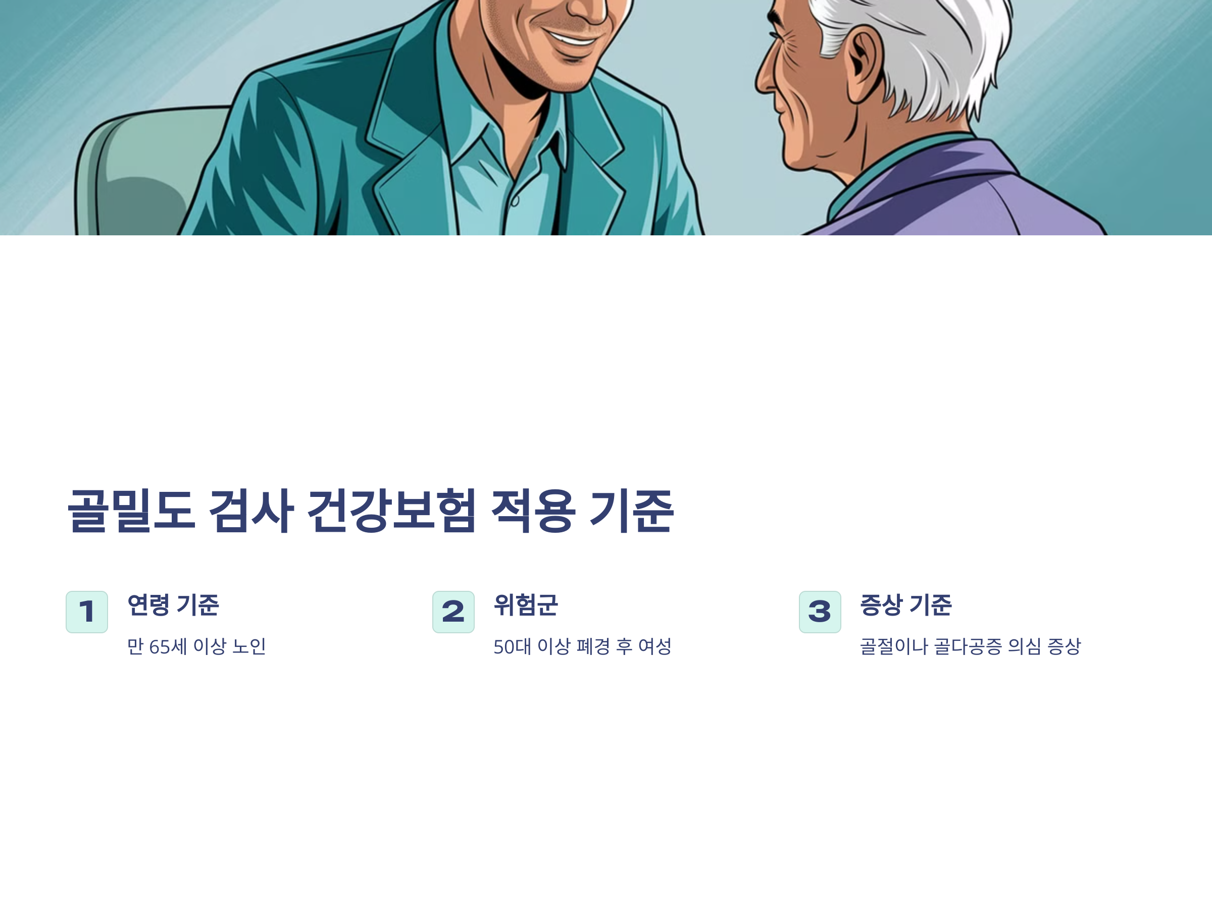 골밀도 검사는 특정 조건을 만족하는 경우 건강보험이 적용됩니다. 우선, 만 65세 이상 노인에게는 골다공증의 위험이 크므로, 일정 조건 하에 건강보험 적용을 받을 수 있습니다. 또한, 50대 이상의 여성 중 폐경 후 골다공증이 의심되는 경우나, 골다공증으로 인한 골절 위험이 높은 사람들은 검사비용의 일부를 건강보험으로 지원받을 수 있습니다. 이러한 조건들은 국민건강보험공단에서 제공하는 기준에 따라 결정됩니다.