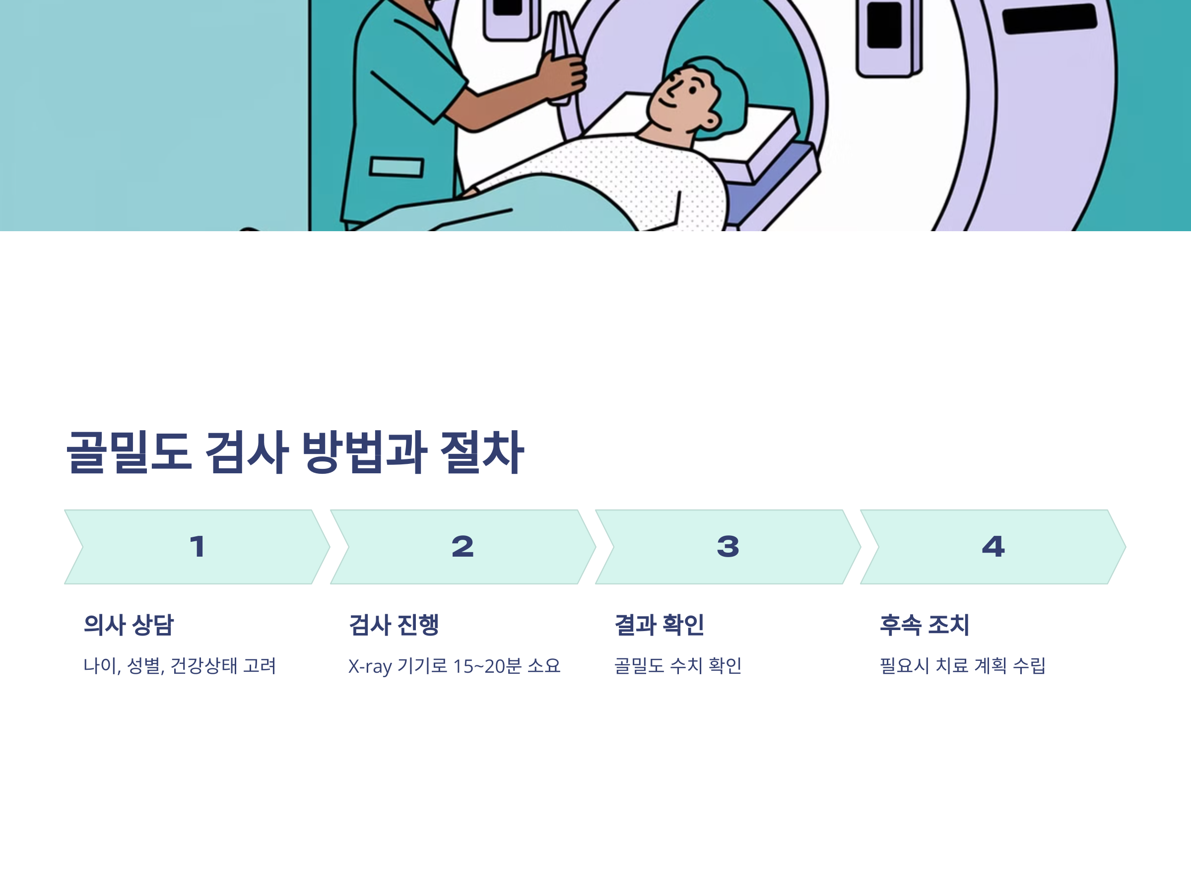 검사를 받고 싶다면, 먼저 병원에서 의사의 상담을 받아야 합니다. 의사는 당신의 나이, 성별, 건강 상태를 고려하여 골밀도 검사를 권유할 수 있습니다. 이후 병원에서 검사를 진행하고, 결과를 바탕으로 필요한 후속 조치를 결정하게 됩니다.