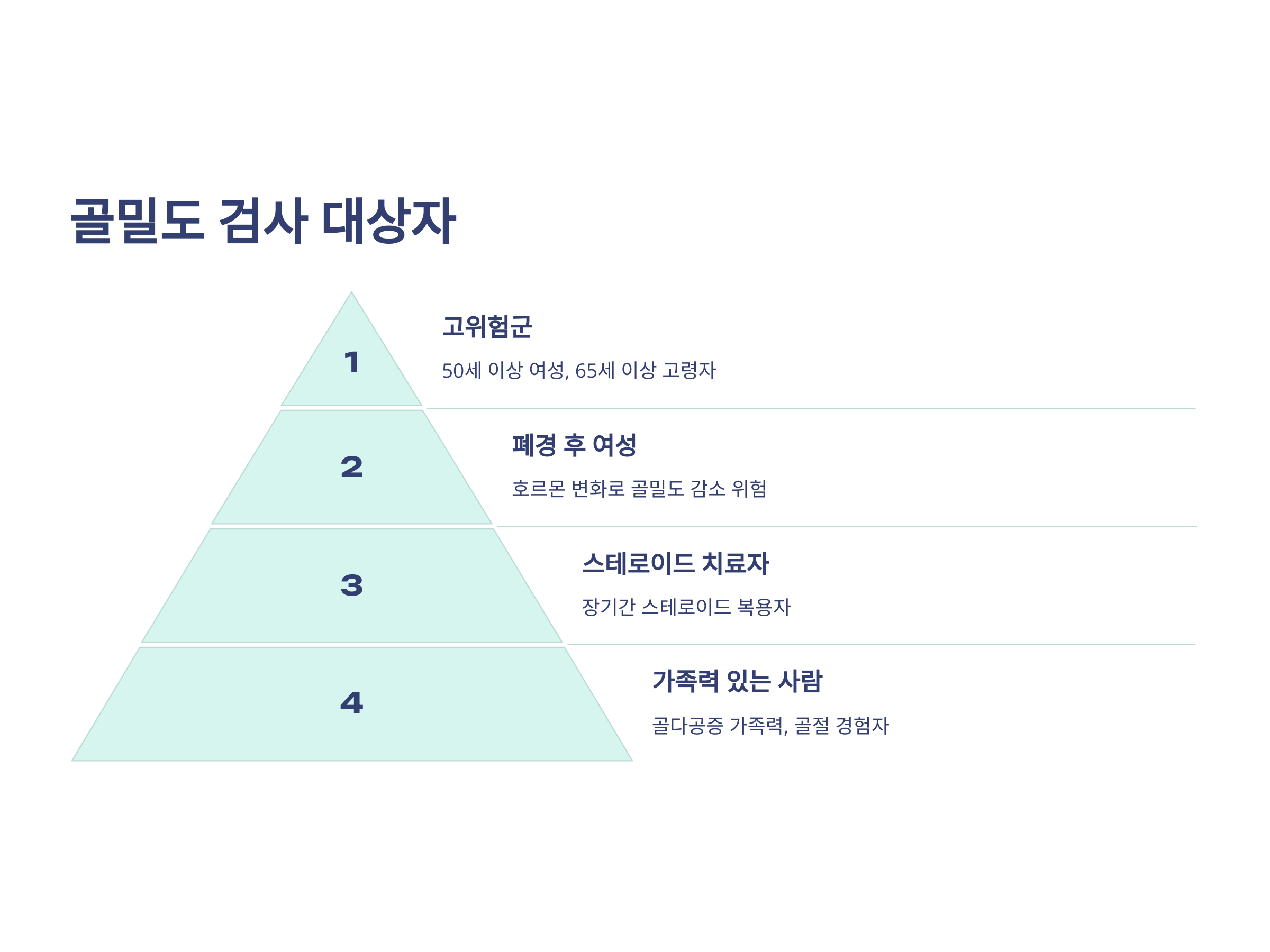 골밀도 검사 대상자는 크게 두 가지로 나눌 수 있습니다. 첫 번째는 고위험군으로 분류되는 사람들입니다. 예를 들어, 50세 이상 여성, 만 65세 이상 고령자, 폐경 후 여성, 장기간 스테로이드 치료를 받은 사람 등은 골다공증의 위험이 높아 골밀도 검사를 받을 자격이 주어집니다. 두 번째는 골다공증의 가족력이 있는 사람이나, 이미 골절을 경험한 사람 등도 골밀도 검사를 통해 빠르게 질환을 확인하고 예방할 수 있습니다.